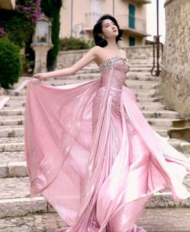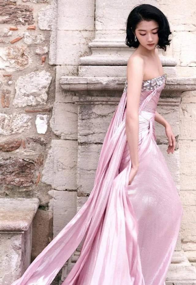 可能是因为她那张充满稚气的脸蛋吧,穿上这种华丽的晚礼服后,总给人一种小孩偷穿大人衣服的感觉。尤其是在那堵古老石墙的映衬下,更显得她有些稚嫩和天真。当然,这并不是说关晓彤不适合这种风格,只是她之前的形象太过深入人心,让人难以一下子接受这种转变。