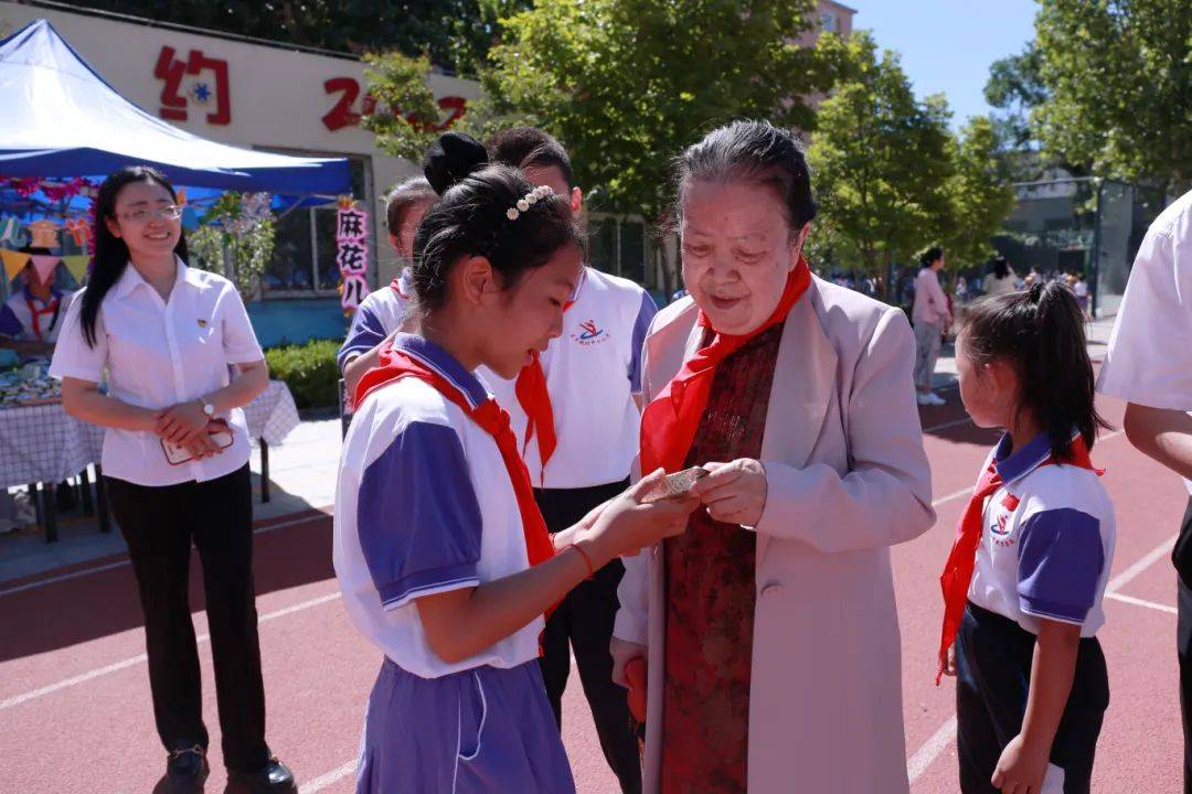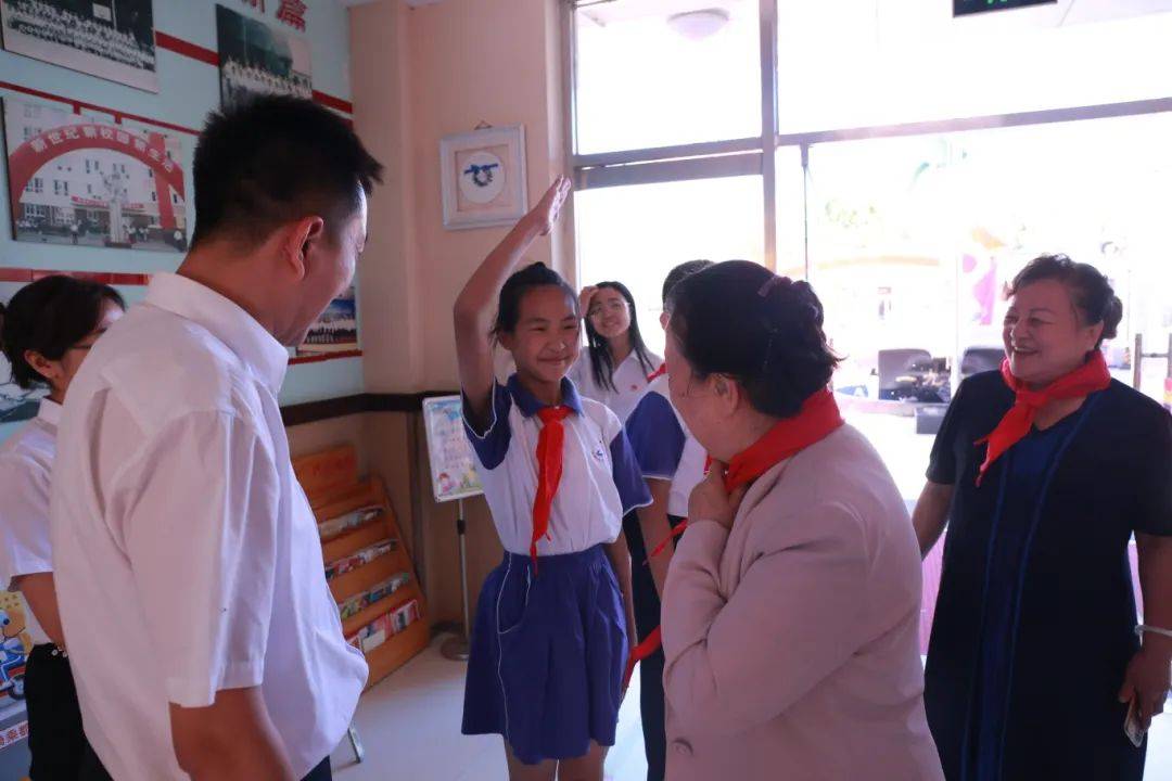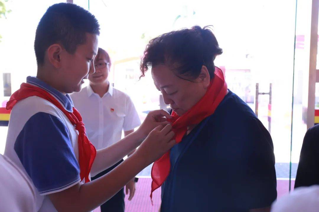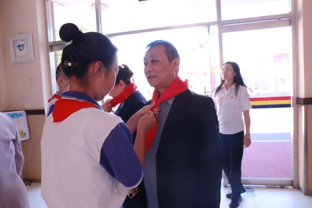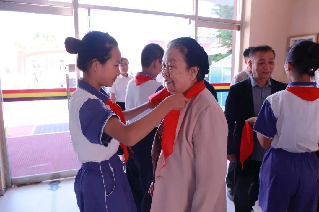 范崇嬿老师一行首先来到教学楼,少先队员们为各位领导和老师献上了红领巾。