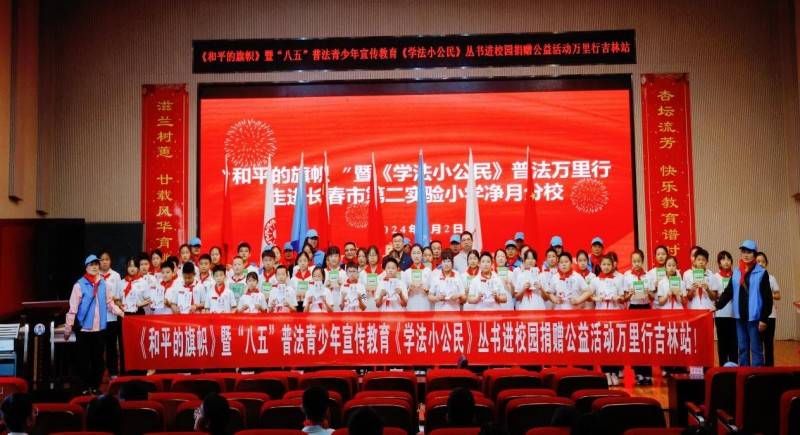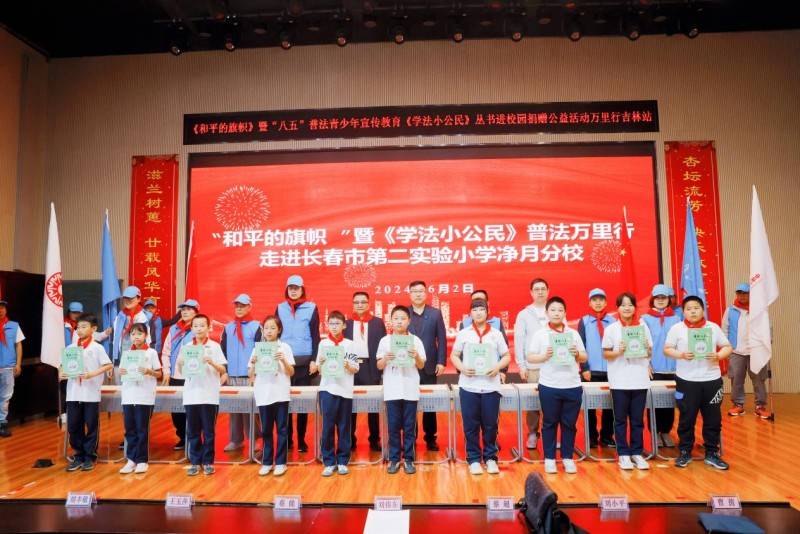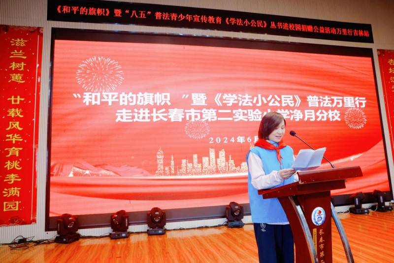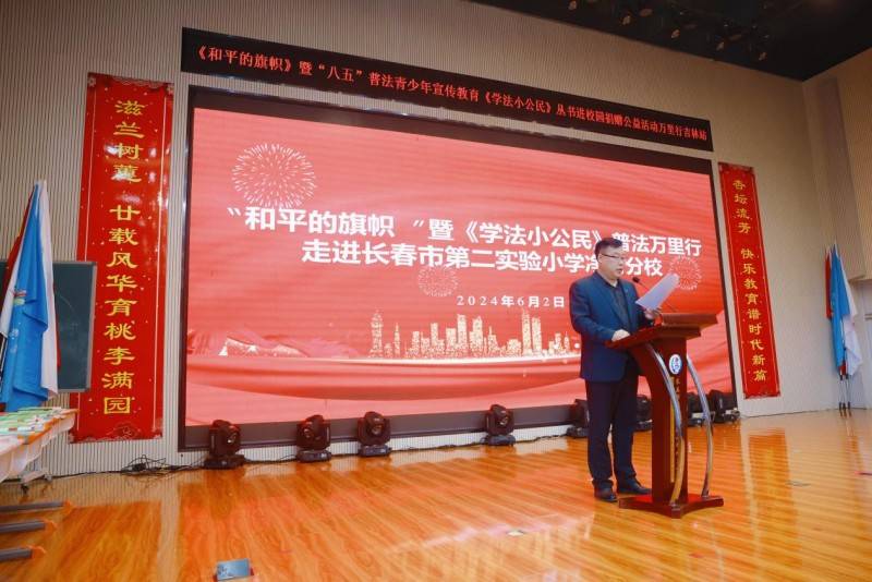 “教育要从娃娃抓起,普法也要从孩子抓起。我们要切实加强青少年学生的法治观念教育和预防犯罪教育,致力于构建和谐、安全、法治的校园环境。”6月2日上午,长春市第二实验小学净月分校校长刘伟东表示。当日,由中华儿童文化艺术促进会组织的 2024年度《和平的旗帜》暨国家“八五”普法规划《学法小公民》普法宣传捐书公益活动走进该校。