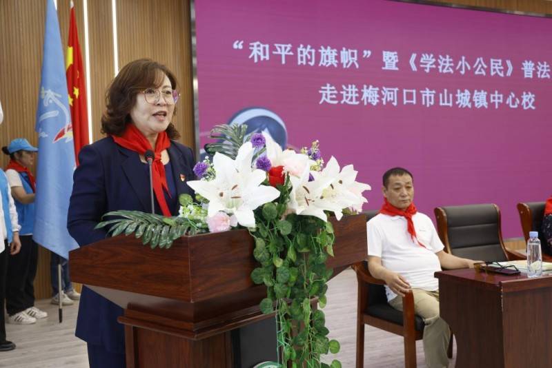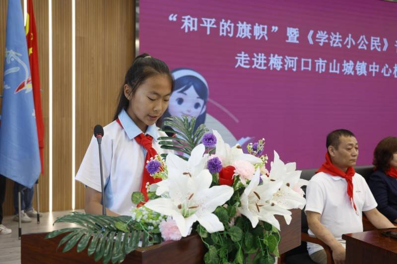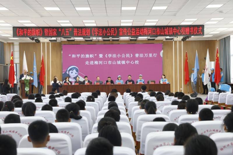 6月3 日上午,由中华儿童文化艺术促进会组织的 《和平的旗帜》暨国家“八五”普法规划《学法小公民》普法宣传捐书公益活动走进吉林省梅河口市山城镇中心学校。