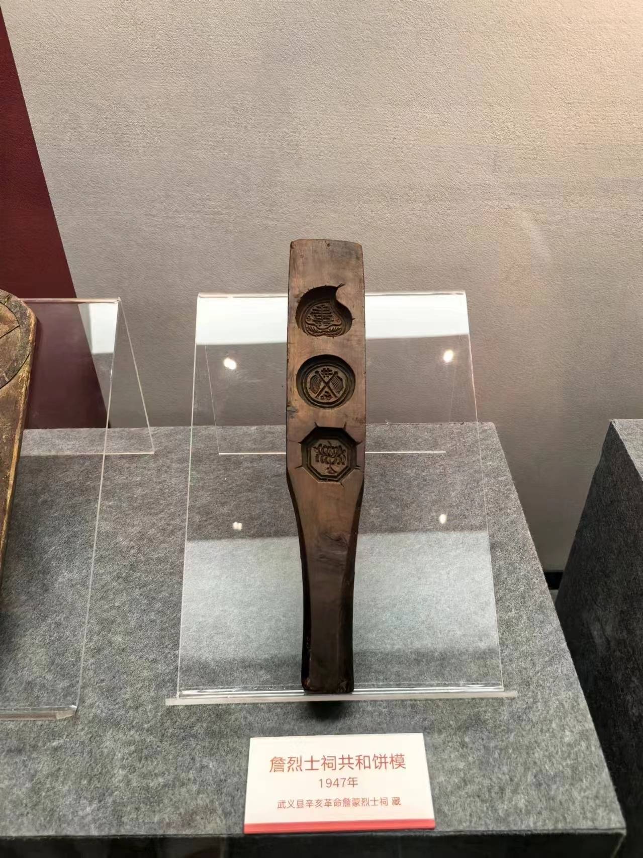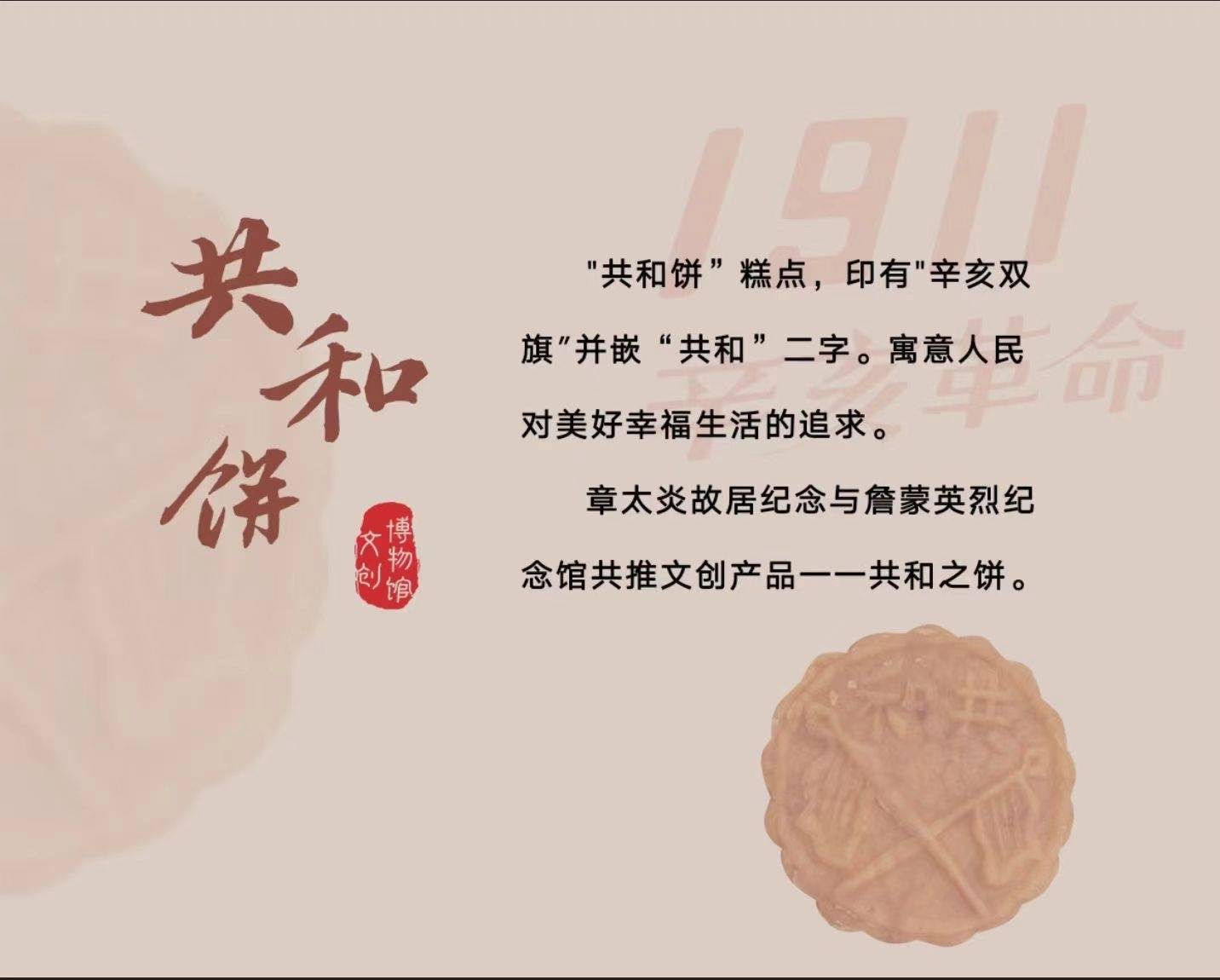 现场还展出了一个木制共和饼模。这是石浦村特有民间制作糕点印模,一般民间制作糕点印模雕刻各种象征福禄寿喜的吉祥图案,而石浦村詹蒙英烈纪念馆共和饼模则雕刻辛亥双旗,中间嵌“共和”二字,构图简洁,雕工细腻,线条清晰,而且寓意深远,有强烈的时代感,是见证推倒封建王朝、民主共和建立的重要纪念物,展现了人们对民主共和幸福生活的追求。为配合此次展览,章太炎故居纪念馆与詹蒙英烈纪念馆共推文创糕点,还原了武义当地的这款共和饼,饼上印有“辛亥双旗”,并嵌“共和”二字。