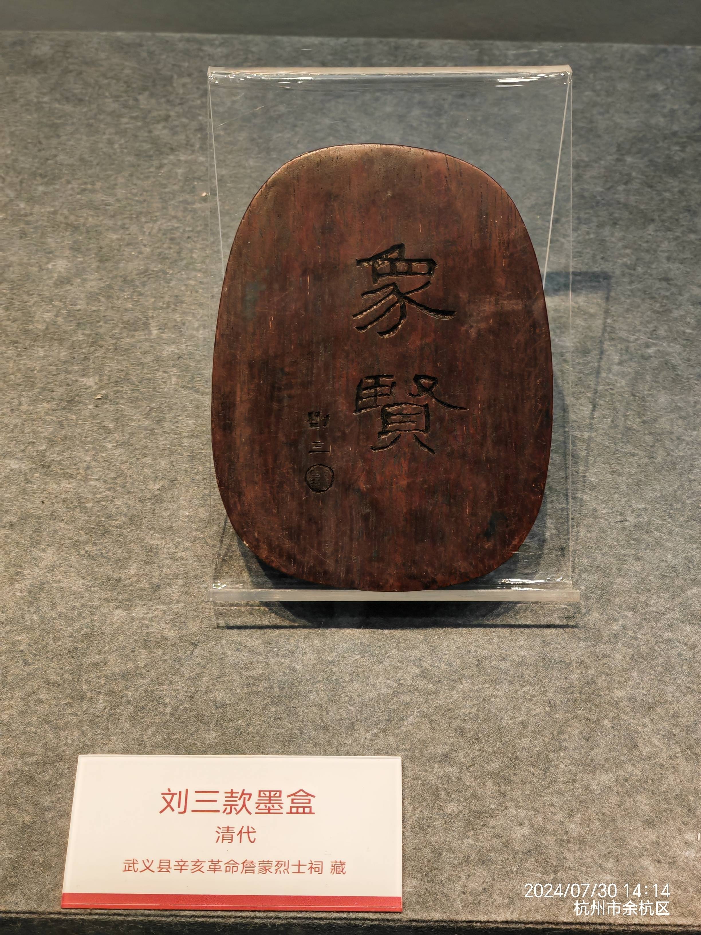 本次展览中展出的一款木制墨盒,是詹蒙在浙江陆军小学堂念书时,老师刘三送给他的。上面有刘三提款“象贤”二字。刘三何许人也?他是当时江南一位有名望的文人,与陈独秀同在陆军小学教书,关系甚笃。1903年初,刘三远赴日本留学,结识了陈独秀、苏曼殊、邹容等人,他与邹容立盟誓结为挚友,共同加入了孙中山创立的同盟会前身——兴中会,从事反清革命宣传。