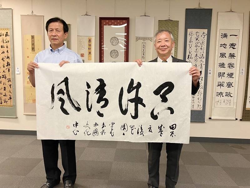 我本人展出十三年前临写的兰亭序,并代表华人书协将书写的“中国文化中心——日本之兰亭”赠呈给中国文化中心以表敬意。