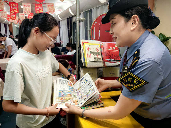 列车长刘永慧,有着二十多年丰富的工作经验,积极响应上级部署要求,扎实开展便民服务活动。暑期乘务期间,刘永慧车长发现车厢里的儿童旅客格外多,每每走到车厢里,都要不断地提醒儿童旅客注意安全,告知监护人安全注意事项,除此之外,碰到比较吵闹的孩童,会第一时间上前询问安抚,还会将孩童引导至车厢图书角,这是本班组的特色便民服务,可以在这里阅读各类书籍,以此来吸引孩子注意力,减少车厢吵闹声,让每位乘车旅客感觉到舒适、便捷、满意。