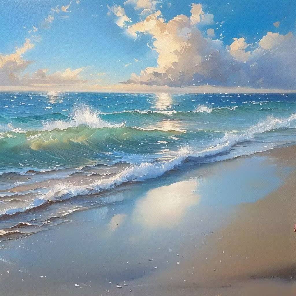 他的作品色彩运用也别具一格。以《波涛汹涌》为例,整幅画作以蓝色为主调,营造出一种宁静而又充满活力的氛围。蓝色的海水与天空相互映衬,形成了一幅美丽的画卷。而在局部细节上,画家则采用了明亮的黄色和白色来点缀,使得整个画面更加生动有趣。这种色彩的搭配既符合自然规律,又富有艺术美感,充分展示了萧雨老师高超的绘画技巧和审美眼光。