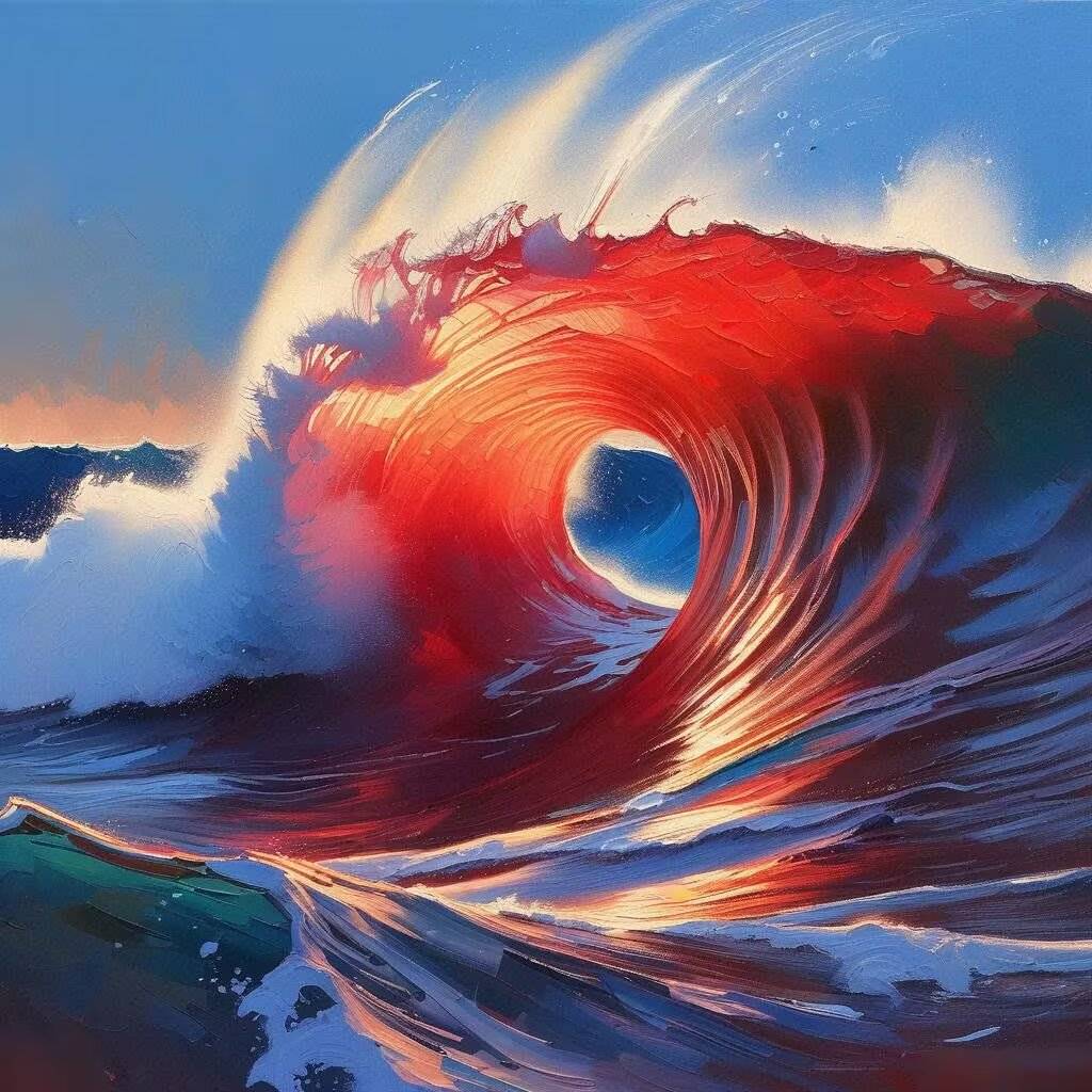 海水作为画面的主体,同样被赋予了强烈的红色调。这种颜色选择打破了我们对大海的传统认知——蓝色或绿色的大海。然而,正是这种大胆的创新让我们看到了一个全新的视角:心中的大海可以是任何颜色,只要它能反映出我们内心的真实感受。因此,这红色的海水更像是我们内心世界的写照,充满了热情、渴望和无尽的梦想。