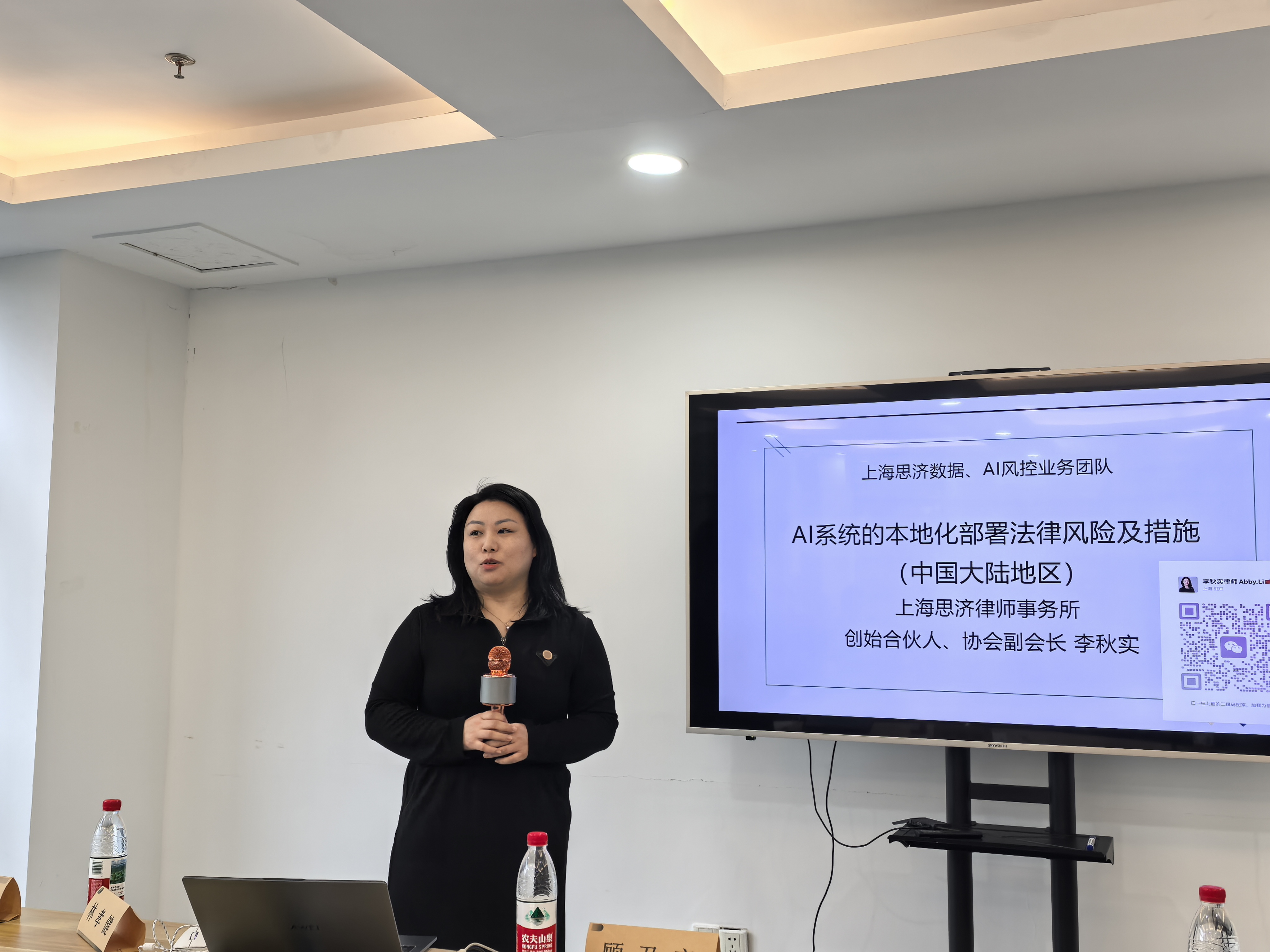 会议第二阶段,上海思济律师事务所高级合伙人上海都市型工业协会副会长李秋实律师立足《生成式人工智能服务管理暂行办法》等政策,从数据合规、知识产权、算法伦理三大维度剖析法律风险。通过虚拟数字人侵权、AI换脸诈骗等典型案例,李律师强调:“企业需构建‘技术研发-应用落地-用户协议’全链条合规体系,在创新与监管间寻求平衡点。”与会企业代表就AI训练数据来源、用户隐私保护等具体问题与律师展开深度交流。