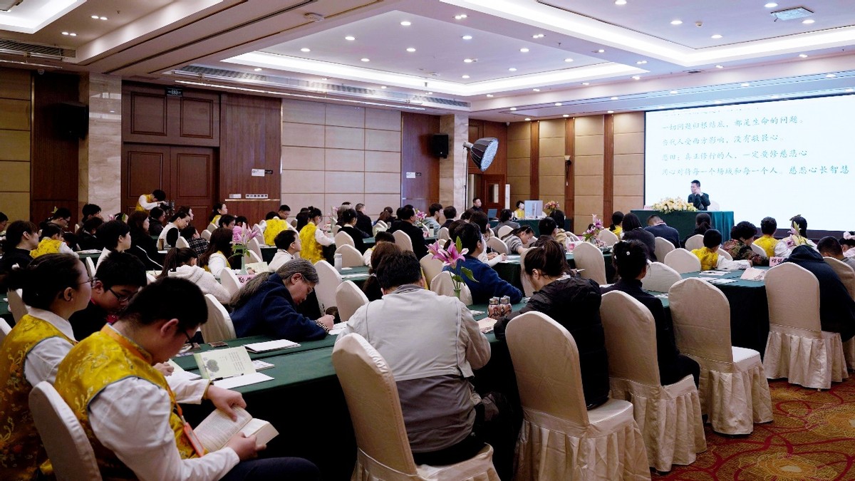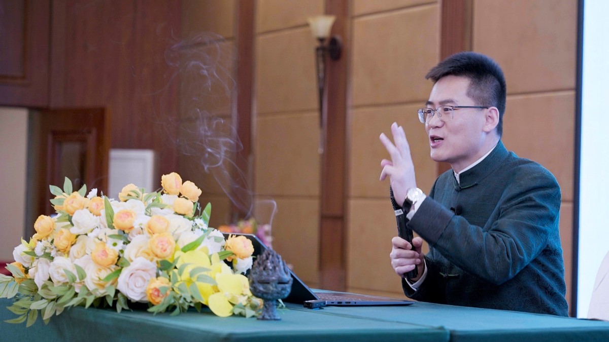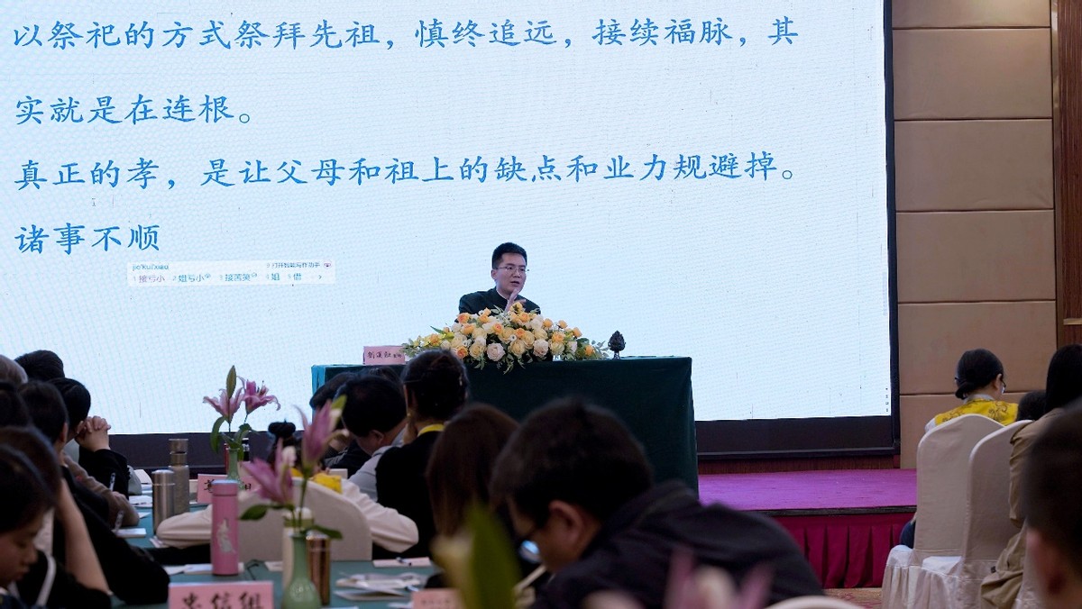 随后,为更好地与祖先连根养根,尚元良书院院长刘汉融老师从社会现象到精神文明,从孝道到仁道,从祭祖连根到教育子女,向前来参加祭祖祈福活动的家人们分享了祭祖的当代意义,深刻阐述了中华优秀传统文化中的智慧精髓,每一个字都仿佛重若千钧,直击人心。刘汉融院长在分享中说,心中有祖,立命有根。祭祖不仅是对祖先的缅怀,更是对家族传承的一种延续和尊重,承载着我们对祖先的敬仰与感恩,是精神与先祖的能量链接,也是传承祖德的重要方式,象征着新的开始和希望。祖先是生命的来源,生命是棵大树,祖先是树根,我们给树根浇水施肥,儿孙才能枝繁叶茂,姹紫嫣红,果实累累,勃勃生机。然而,祭祖还是孝道文化的体现,通过祭祖提醒后人不忘根本、知恩报恩。同时,知晓生之短暂,才倍加珍惜当下,学会铭记和感恩。祭祖不是形式,是孝心的传递,是血脉的传承、文化的传播,更是幸福路上的敦伦尽分。