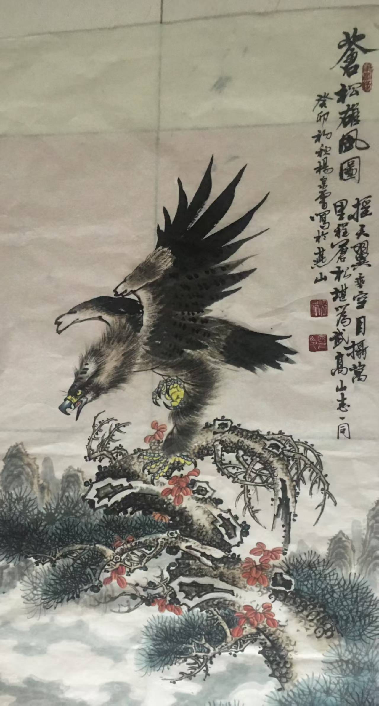 在当代中国工笔画的演进中,杨泉已占据独特的历史坐标。他既恪守“工写结合”的传统法则——如《荷花鱼》中对物象真实性的执着与写意韵味的保留,又突破程式化表达的限制。不同于部分当代工笔画家追求的极端写实或抽象化倾向,杨泉曾在精确与模糊之间找到了动态平衡。这种平衡体现在《雄鹰图》的空间处理上:他既通过工笔技法精确捕捉鹰隼羽毛的肌理,又通过背景的大面积留白营造虚实相生的空间感。