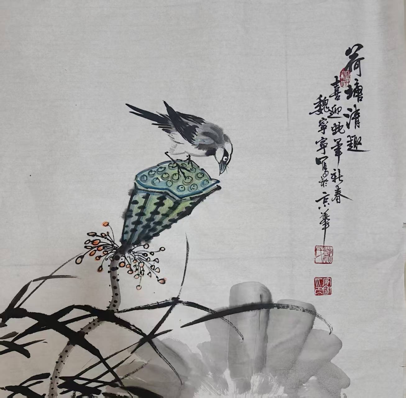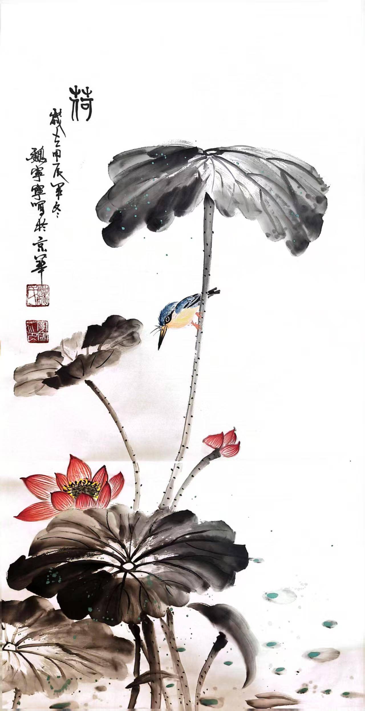在《莲池清趣》系列中,魏宁宁突破水墨的固有色系,将敦煌壁画历经千年风霜却依旧瑰丽的色彩美学注入创作。她以石青打底,赭石层层积染,辅以敦煌特有的青金石研磨出的湛蓝,使画面既有唐代的富丽堂皇,又具宋人水墨的含蓄蕴藉。令人惊艳的是,她在传统的"随类赋彩"原则中融入现代色彩学理念:通过明度梯度变化表现光影,利用补色对比强化视觉张力。这种对矿彩技法与现代色彩学的创造性融合,使画面呈现出瓷釉般晶莹剔透的质感,既保持水墨的书写性,又增添油画般的厚重感。