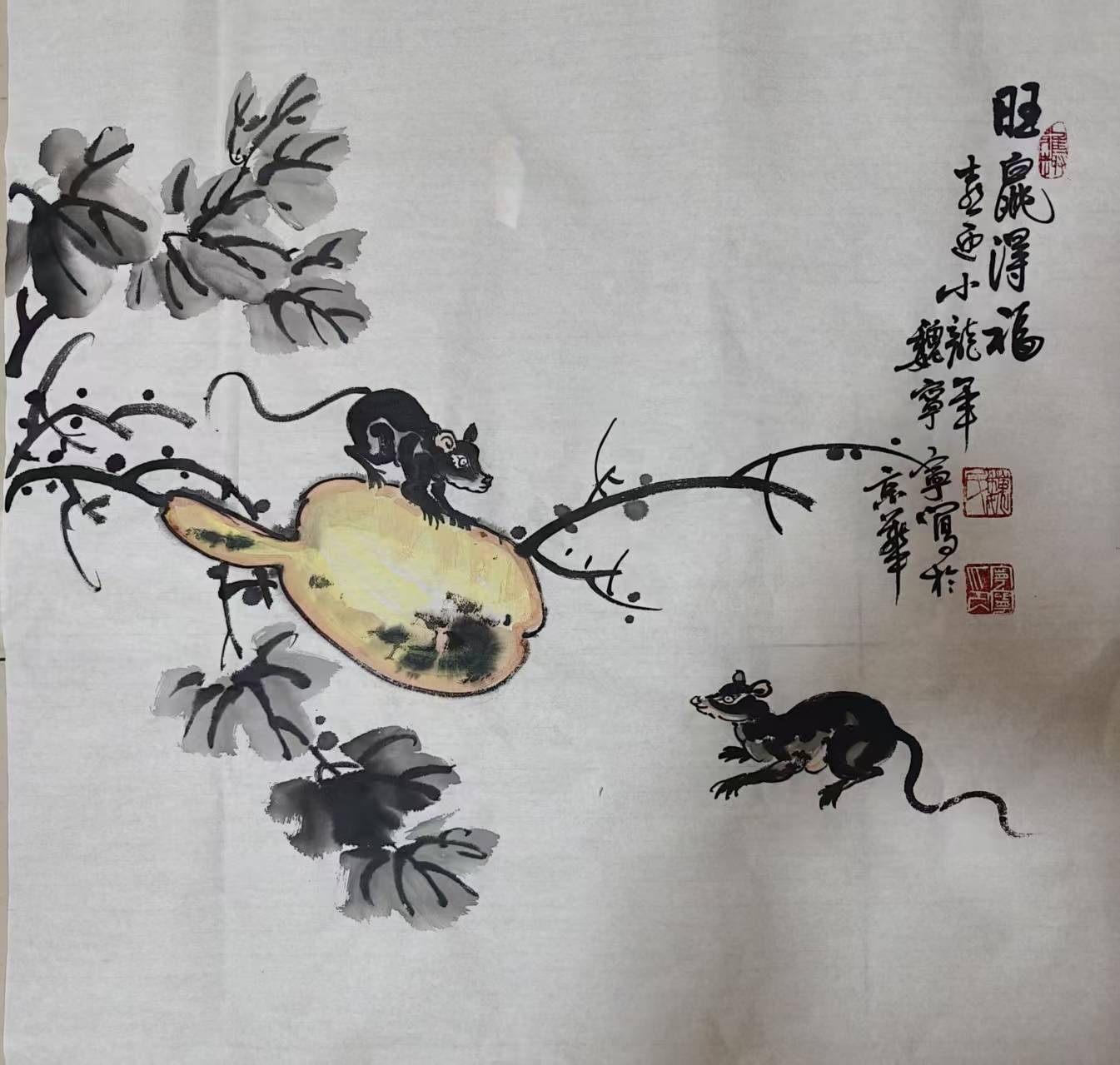 在《荷塘絮语》中,锦鲤游弋的灵动姿态被赋予全新的诠释。魏宁宁独创"拓印皴擦"技法:先以胶矾水在生宣上晕染出水草肌理,再以朱砂点厾鱼眼,最后以湿画法表现水面波光。这种技法的创新性在于打破传统工笔的"三矾九染"定式,将民间工艺的拓印技法与传统皴法有机结合。画面中,或浓或淡的水痕既呈现水墨交融的自然天趣,又暗合东方哲学"上善若水"的精神内核,展现出笔墨语言在当代语境下的无限可能。