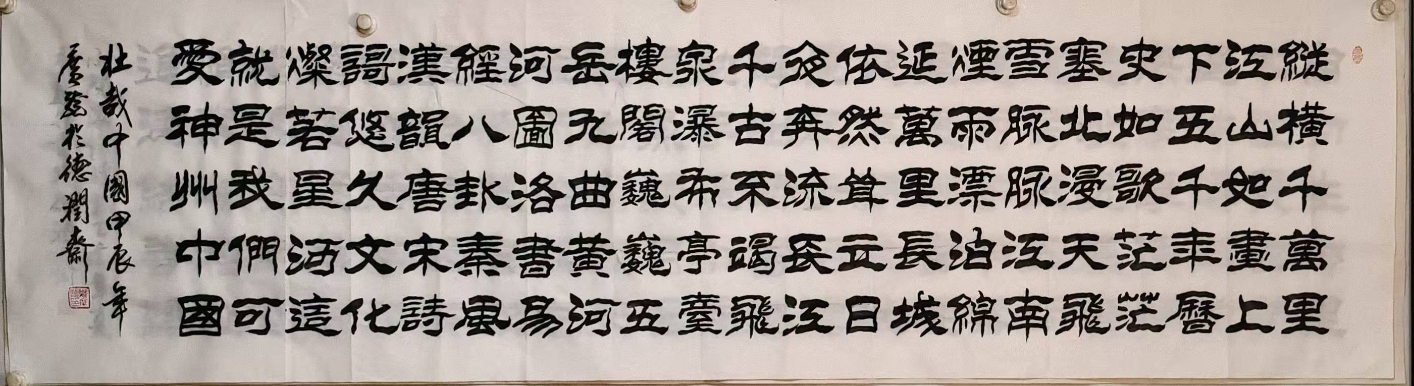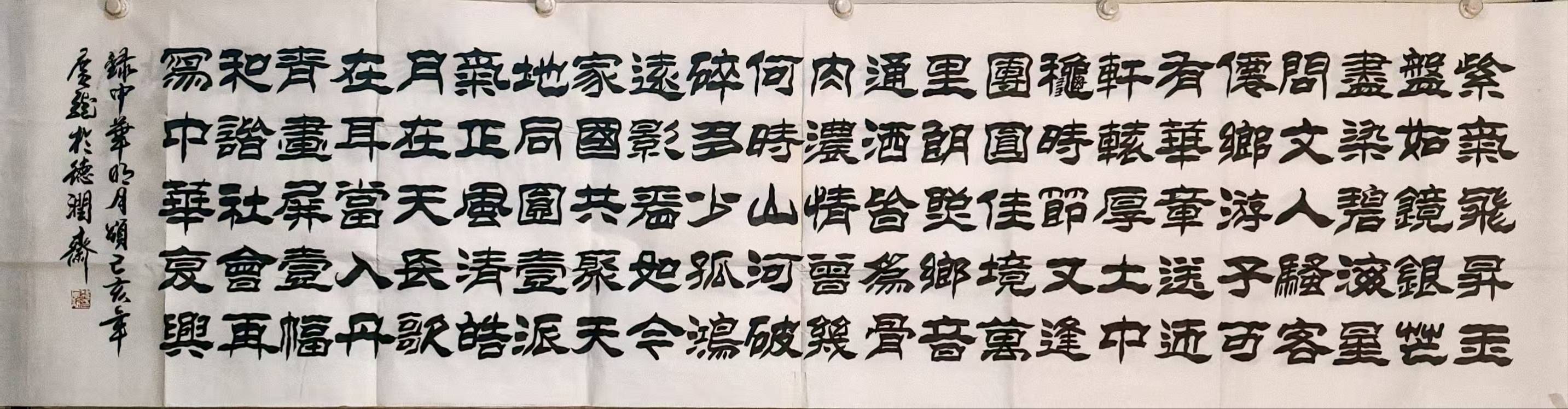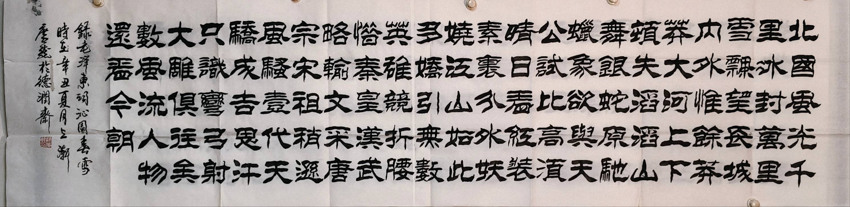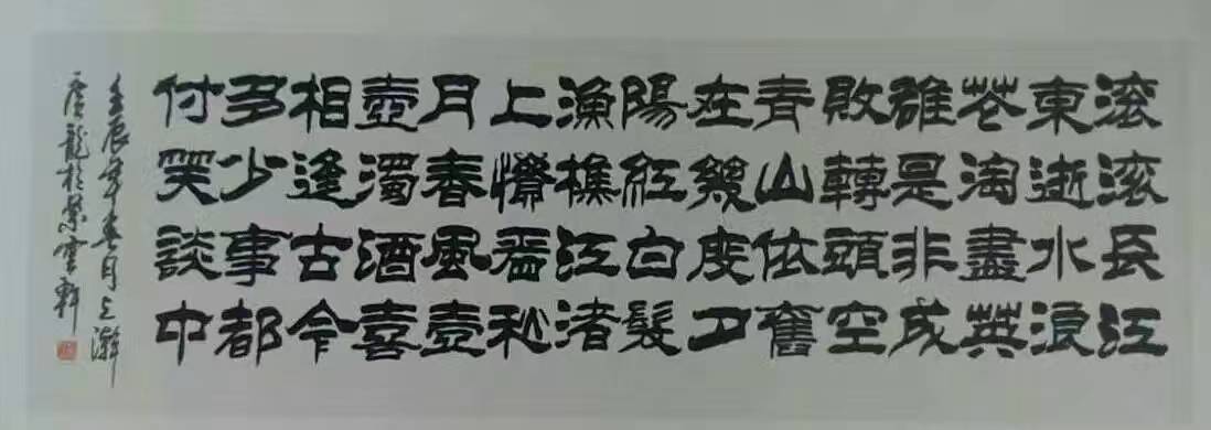魏广龙的艺术远不止于本土传承。其隶书《曹全碑》临本在意大利米兰艺术馆展出时,西方观众惊叹于东方艺术的时空纵深——笔势的起承转合间,既保持着汉代碑刻的金石气韵,又跃动着现代美学的空间意识。这种突破地域界限的艺术表达,印证了黄宾虹"守常达变"的艺术真谛。