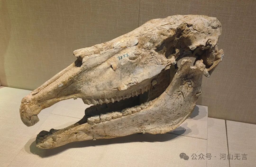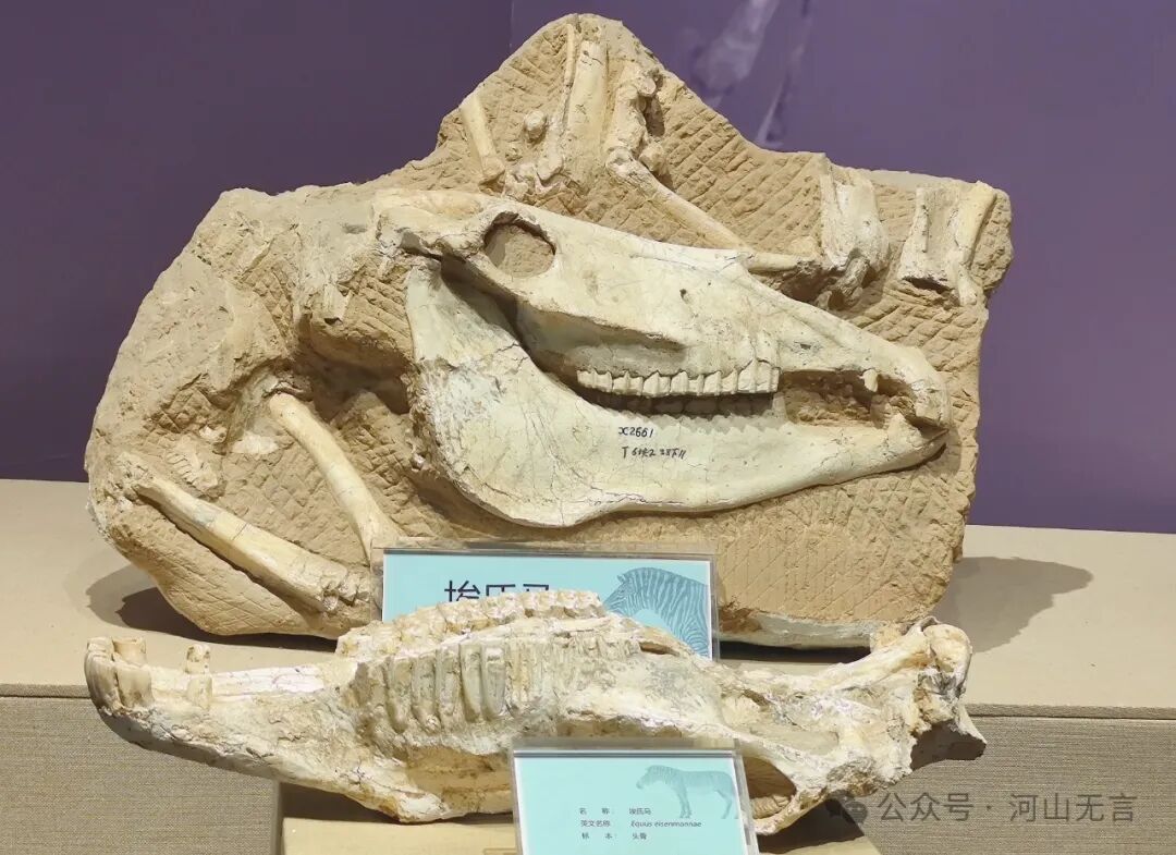 真马动物群-埃氏马头骨化石。它以法国著名古生物学家埃森曼命名。埃氏马仅发现于临夏和政地区,它是世界上最大的真马,它的头骨长度达到0.73米,被称为世界上脸最长的马,其头部占身体的比重,在所有马当中也是最大的。现今的马、驴、斑马也属于真马家族的成员,也是仅存的马科动物。