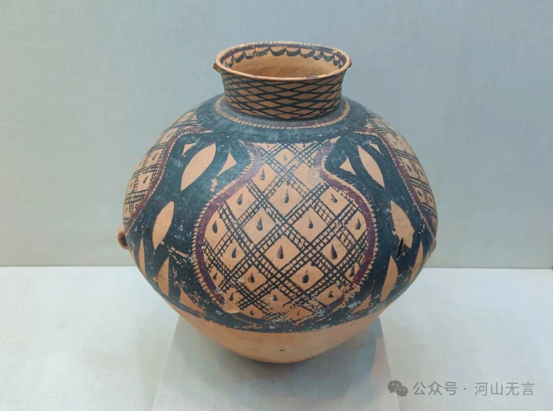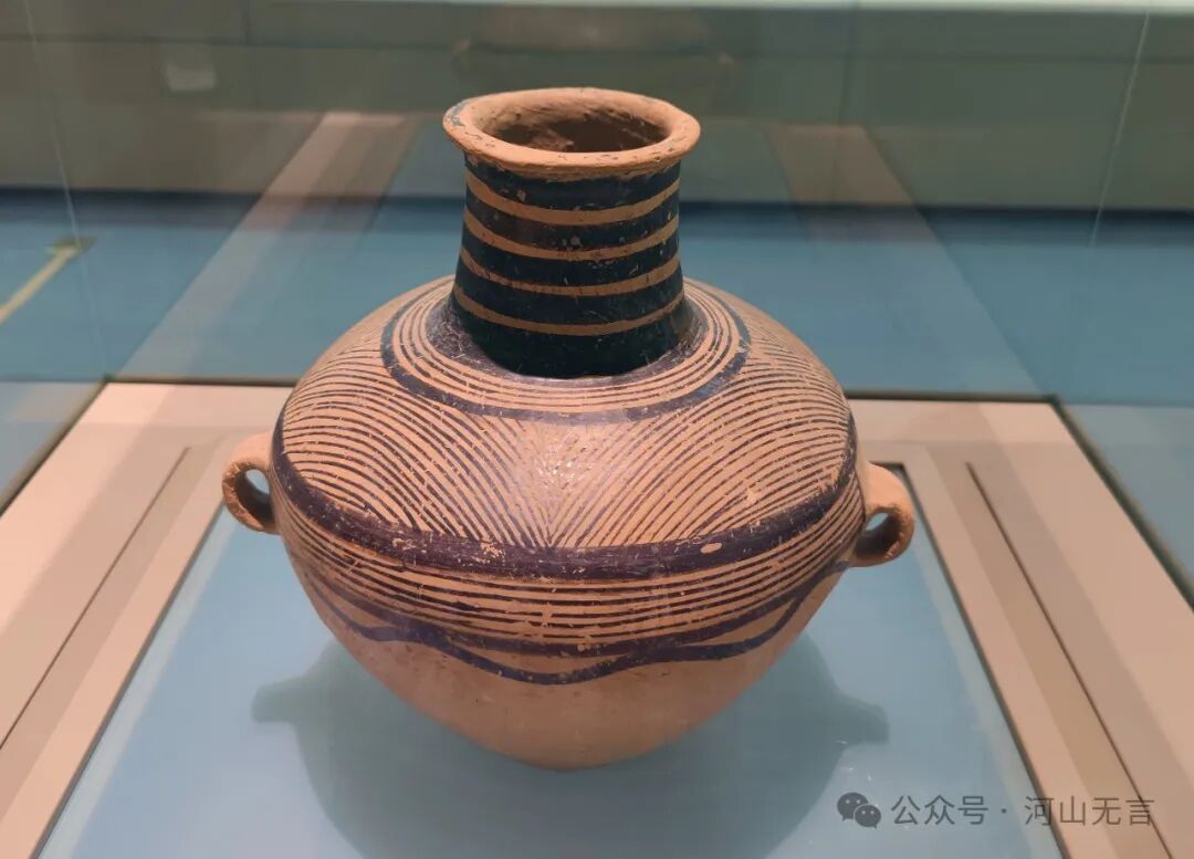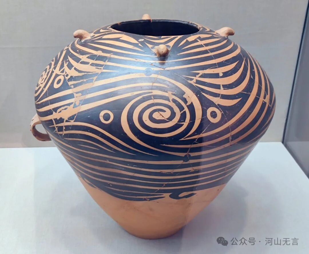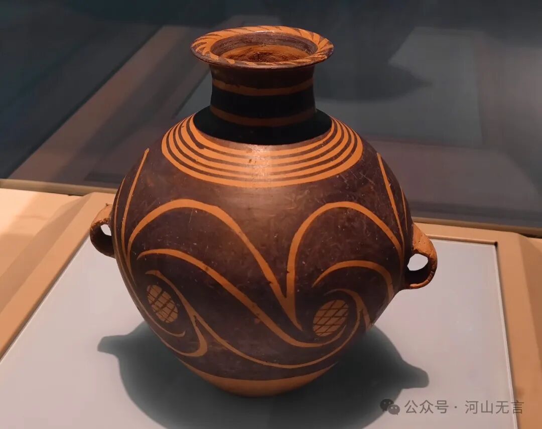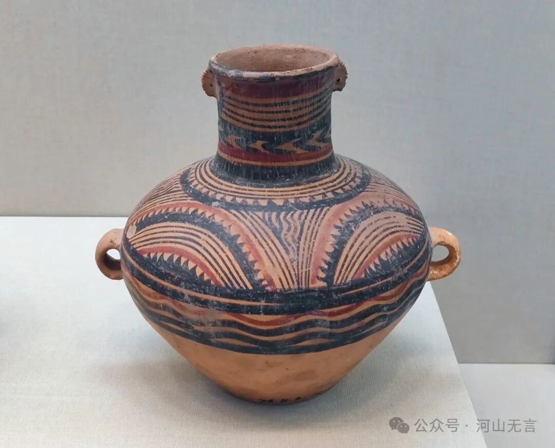 马家窑文化马家窑类型(公元前3300年-前2700年)的典型彩陶,纹饰线条与精细流畅的水波纹为主,反映了远古先民对水的崇拜: