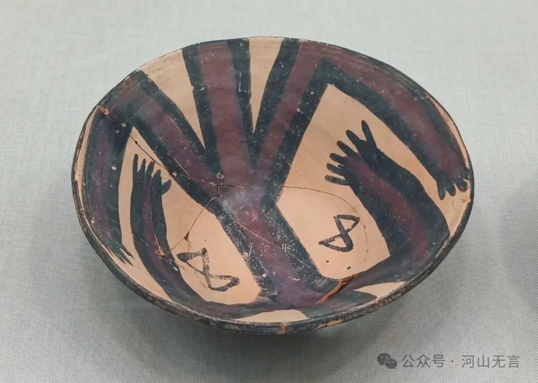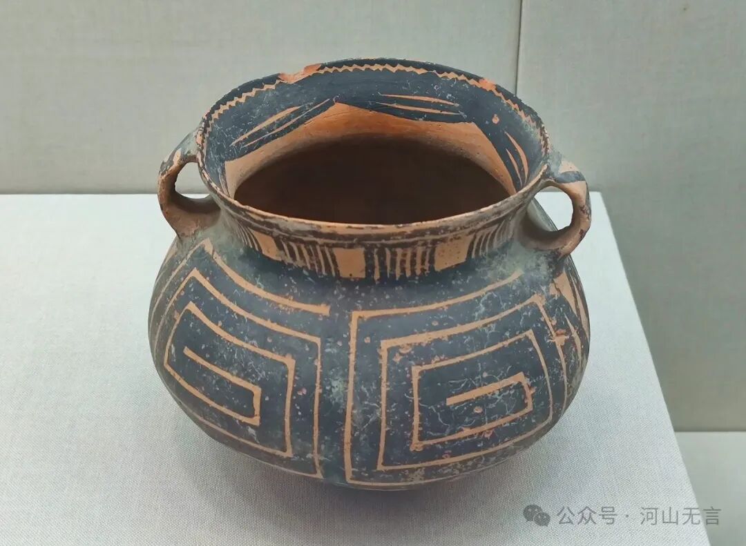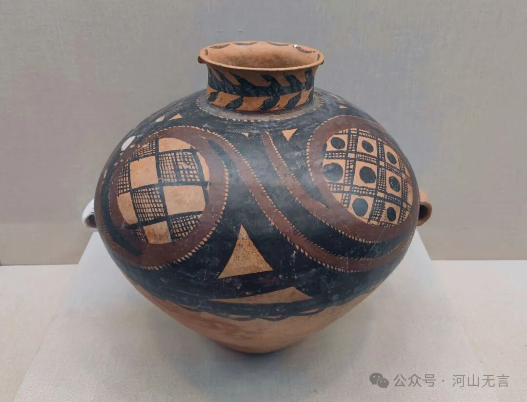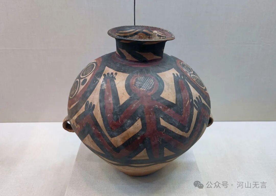 马家窑文化边家林类型(公元前2850年-前2650年)的典型彩陶,饰纹以弧形锯齿纹、弧形纹、三角折线纹为特点: