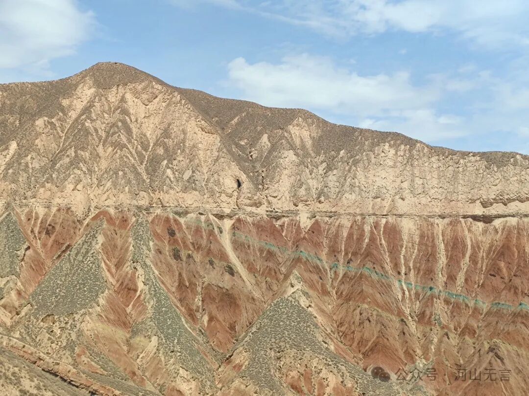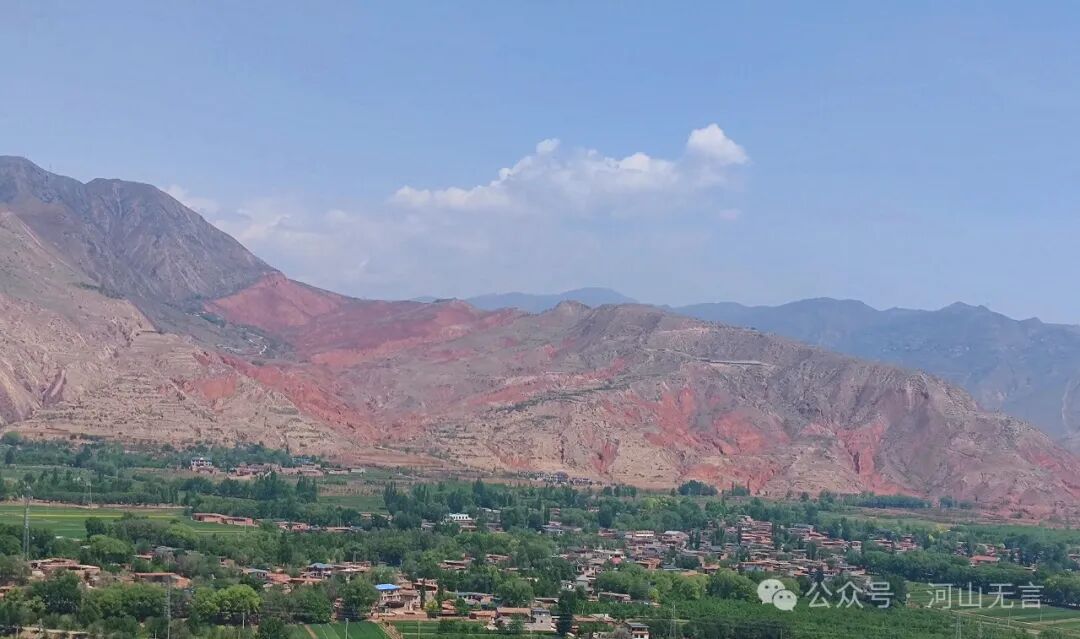 远处山坡上的红色岩层露头,是临夏盆地的新生代古近纪至新近纪的沉积地层。