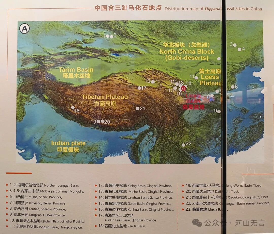 中国三趾马化石产地分布图。它表明晚中新世至早上新世,统一的青藏地块形成并隆升过程中,经剥蚀和夷平,形成了广泛的准平原,使得三趾马动物群在东亚的交流没有大的地理障碍。