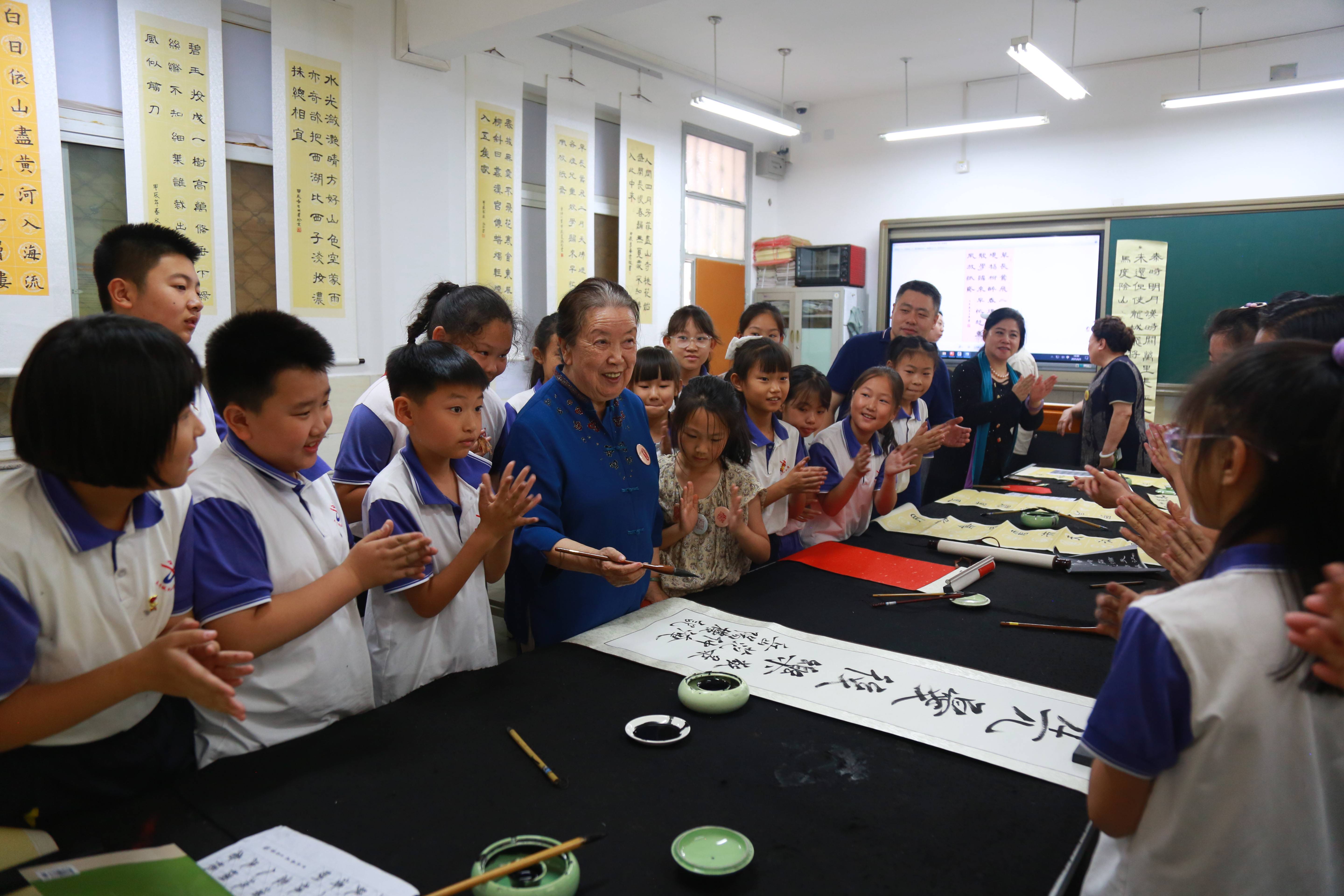 范崇嬿主席高度评价集团成果:“城北小学将非遗转化为‘可感、可创、可传’的校园实践,为‘寻百计划’提供了范本!”范崇嬿强调:青少年是非遗活态传承的核心力量,不仅是非遗技艺的"接棒者",更是文化基因的"再造者"。他们通过教育奠基化解传承危机,借助创新思维打破文化边界,依托多元实践构建可持续生态,最终实现非遗从"活下来"到"活起来"的质变。为学校开展非遗工作提出三点要求:学校要继续坚守传承非遗的重大责任;继续做好艺与趣的引导;继续为师生搭建快乐成长的平台,做好家、校、社三联动的非遗传承生态链。范崇嬿还现场赠送了她创作的童趣作品以及个人著作。