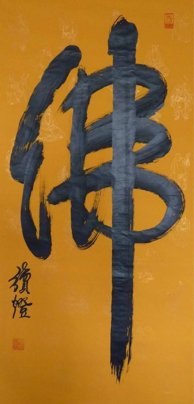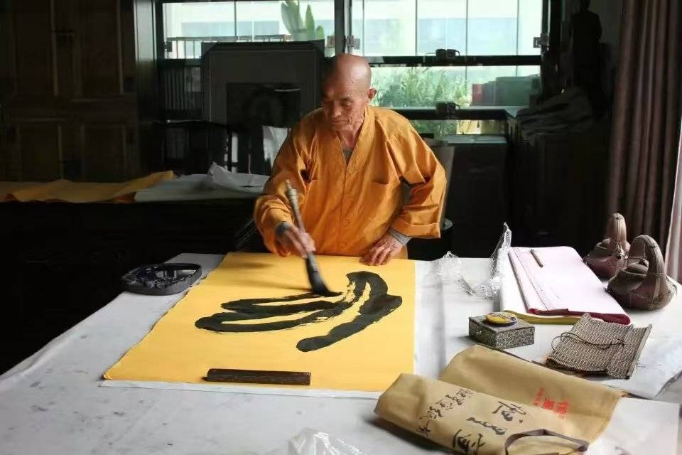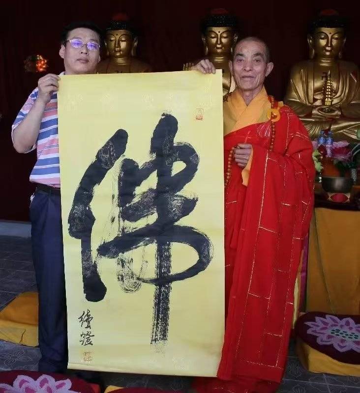 法师不仅是佛门高僧,更是一位杰出的书法艺术家。他数十年如一日勤修书法,尤其独创"一笔佛"书体——字体雄浑厚重,笔势潇洒流畅,每一笔都蕴含禅定功夫,每一画都沉淀佛法智慧。他的书法作品不仅被海内外收藏家珍视,更成为佛门艺术的瑰宝。