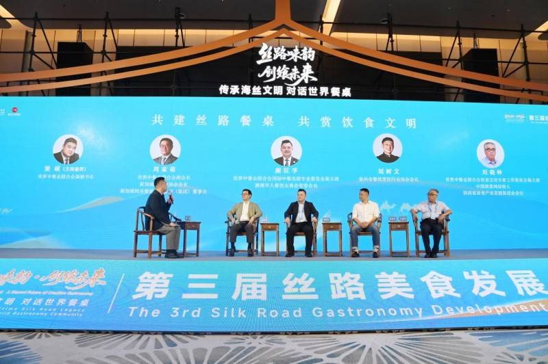在圆桌对话环节,世界中餐业联合会副秘书长梁硕邀请世界中餐业联合会副会长、新加坡同乐餐饮有限公司(集团)董事长周家萌,世界中餐业联合会国际中餐名厨专业委员会副主席、澳洲华人餐饮业商会荣誉会长糜征孚,泉州市美食产业促进会副会长、泉州市餐饮烹饪行业协会会长刘树文,世界中餐业联合会饮食文化专家工作委员会副主席、中国陕菜网创始人、陕西省面食产业发展促进会会长刘晓钟,围绕“共建丝路餐桌·共赏饮食文明”这一主题,共同探讨丝路美食的交流、合作与共享。