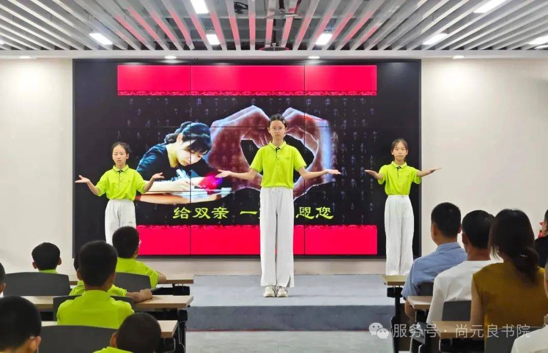感恩与立志之情,更在曼妙手语中脉脉流淌。“父兮生我,母兮鞠我……”一曲古韵悠扬的《跪羊图》手语舞翩然而起,少年们以手传心,将至孝深情化作无声的韵律,如无声诗画,在孩子们虔诚的指尖轻舞间缓缓展开。柔婉的肢体语言诉说着羔羊跪乳的深恩,诠释着反哺之义的无言重量。观礼席上,父母眼中泪光潋滟,无声的感动在血脉亲情间深深共鸣。