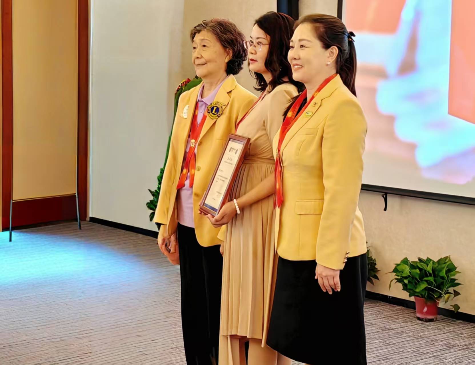 7月5日,中国残联原副主席汤小泉(左)为王好凤颁发卓越贡献嘉许状