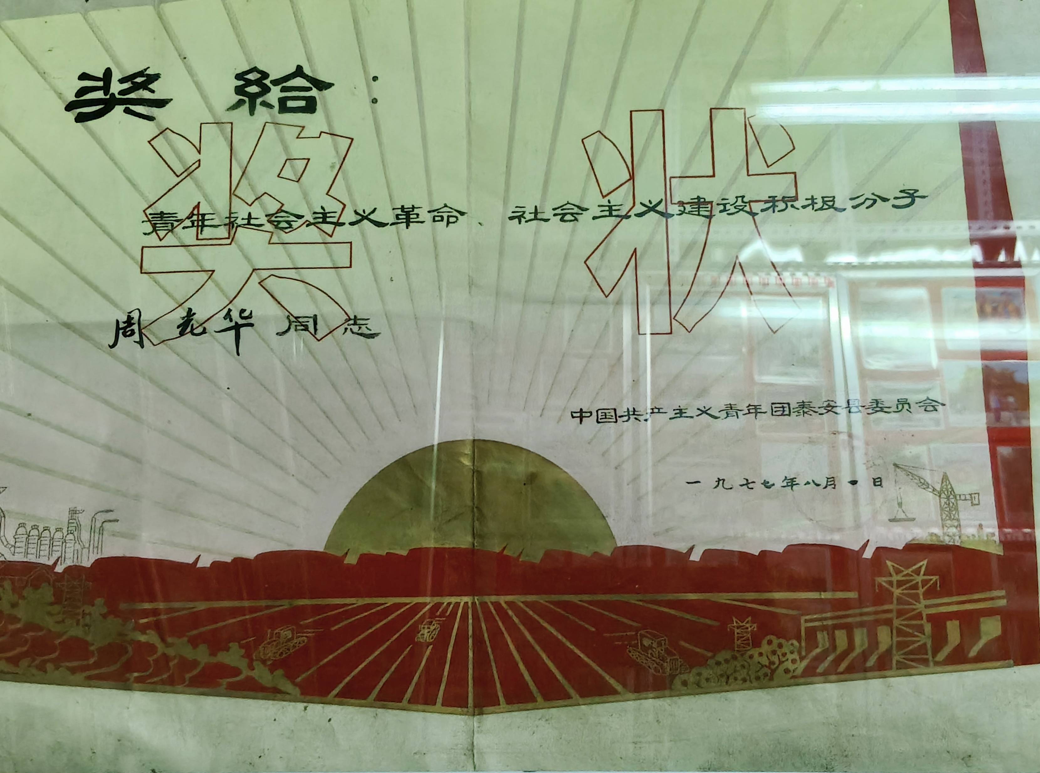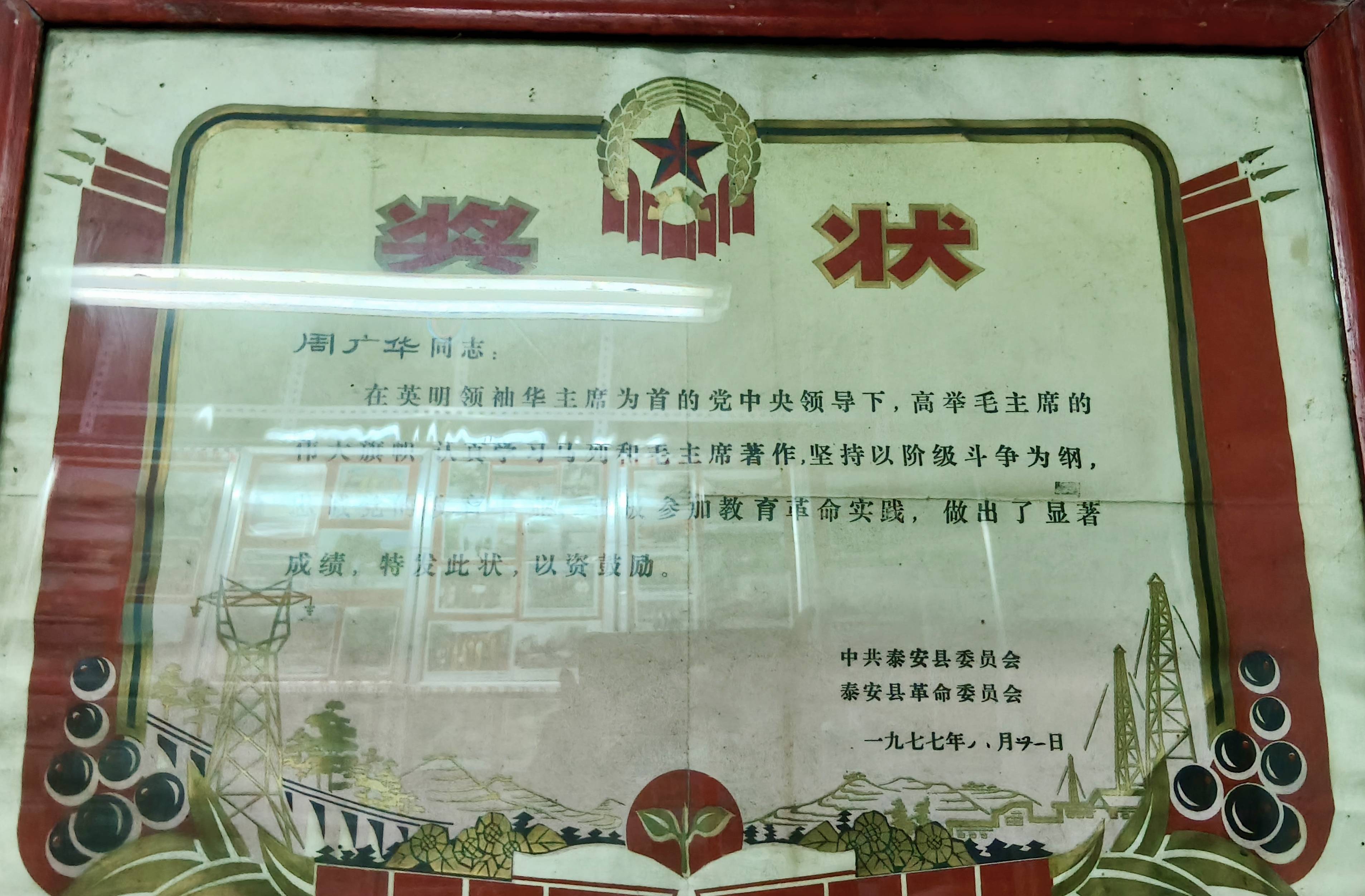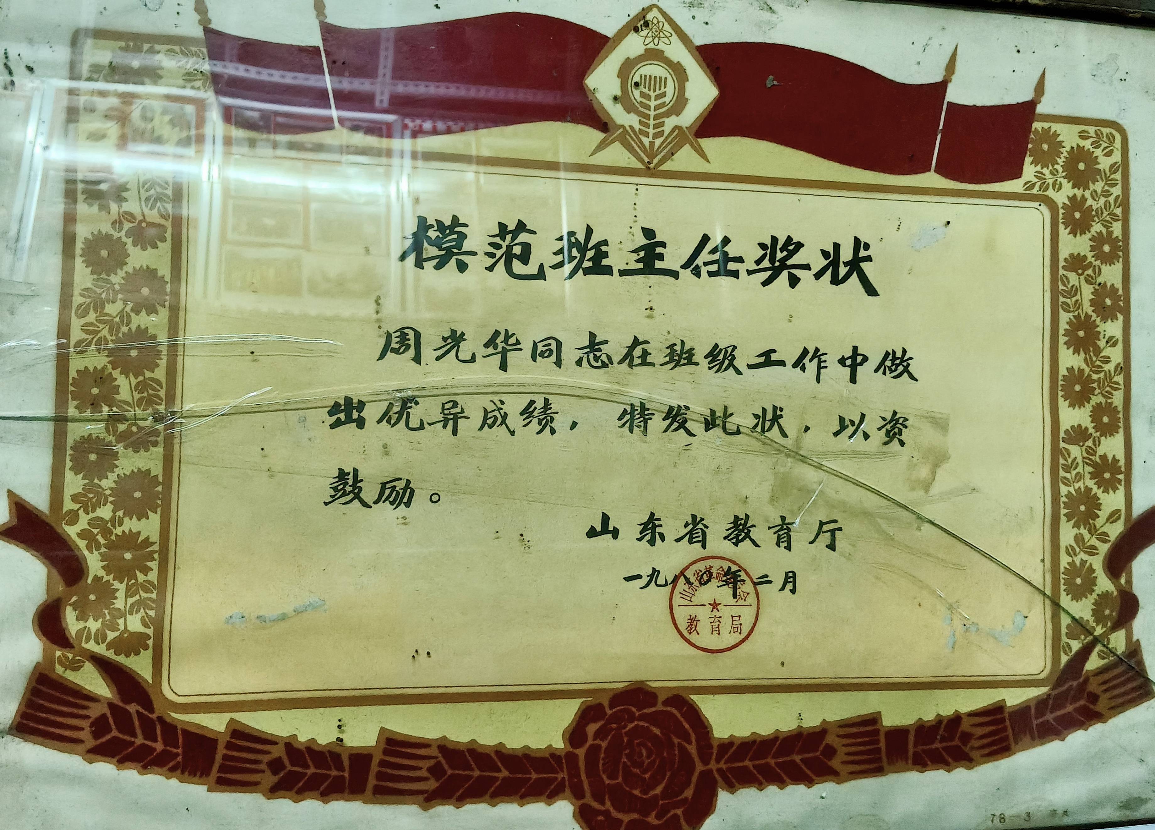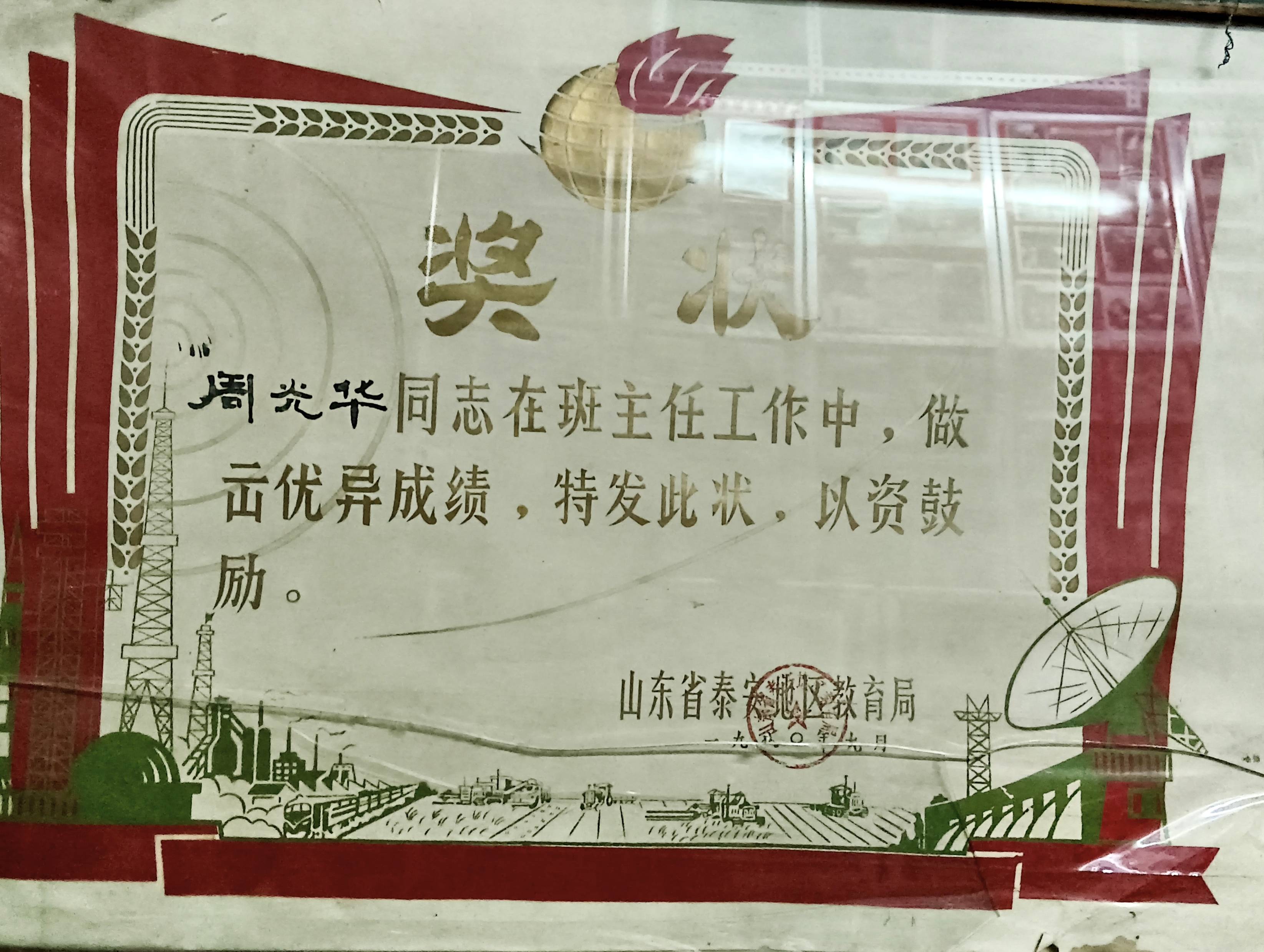 在泰安大汶口的周家院文化馆群中,一排装裱的老奖状静静陈列。玻璃镜面映着岁月痕迹,泛黄纸页上,“新长征突击手”“模范班主任”等字样却依旧醒目,落款处山东省教育厅、共青团相关机构的印章,将时光拉回激情燃烧的年代——这是周广华(部分奖状署“周光华”,为同一人不同书写或时代印记)在教育岗位、青年工作中留下的奋斗注脚。