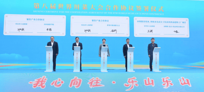 开幕式上,世界中餐业联合会与乐山市人民政府签订战略合作框架协议,四川旅游学院和乐山市人民政府、冰极限(北京)食品科技有限公司和市中区政府签订合作协议,以及众多家企业集体签约涵盖人才培养、文旅融合、食材采购等多个领域的商务协议,推动资源整合与产业协同发展。