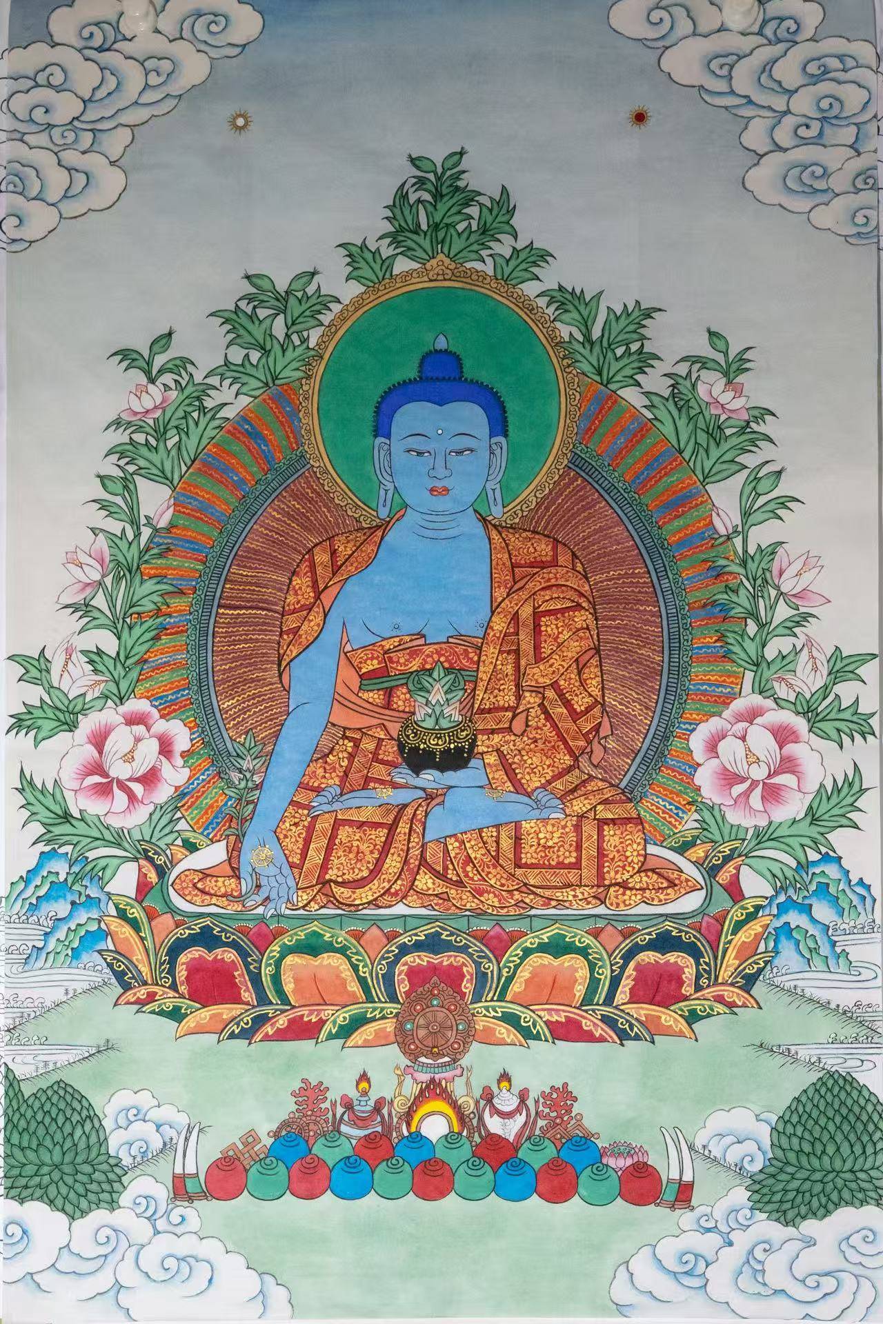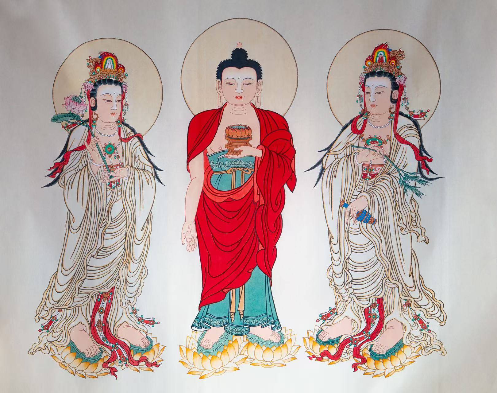 2018年开始创作的《西方三圣像》是她艺术与信仰的集大成之作。创作中,手脚部分修改不下三次,有时已上色完工,发现细节不合格也果断重来。“不圆满的画作,我都请师父妥善送走。”这份敬畏,让最终完成的作品每一处都经得起《造像量度经》的丈量。