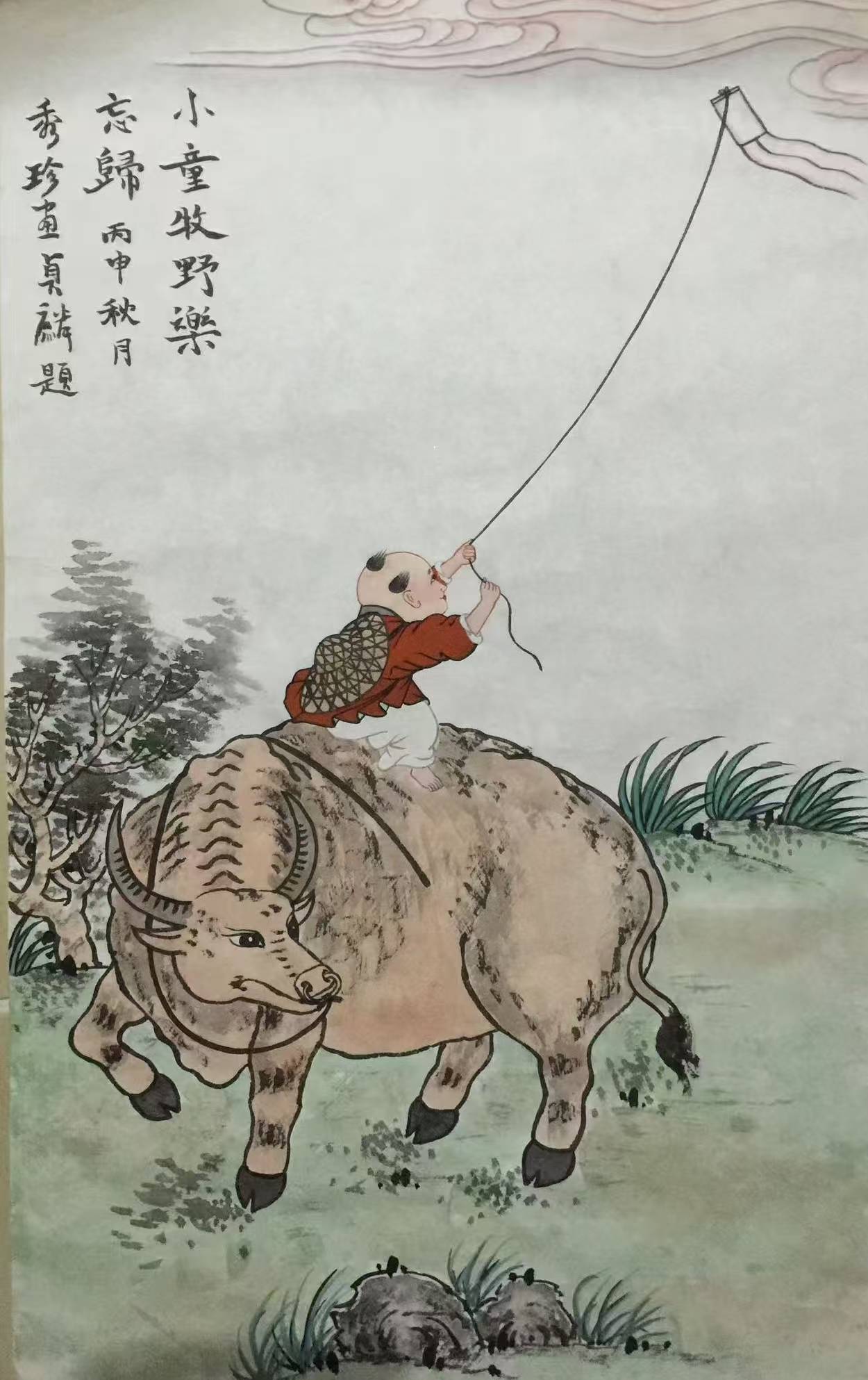 客厅另一侧墙上,一幅婴戏图与佛像画相映成趣。画中孩童戏耍观鱼,憨态可掬,设色明净柔和,充满人间烟火气。这恰好体现了朱秀珍艺术世界的两个面向:庄严法相与世俗生趣。