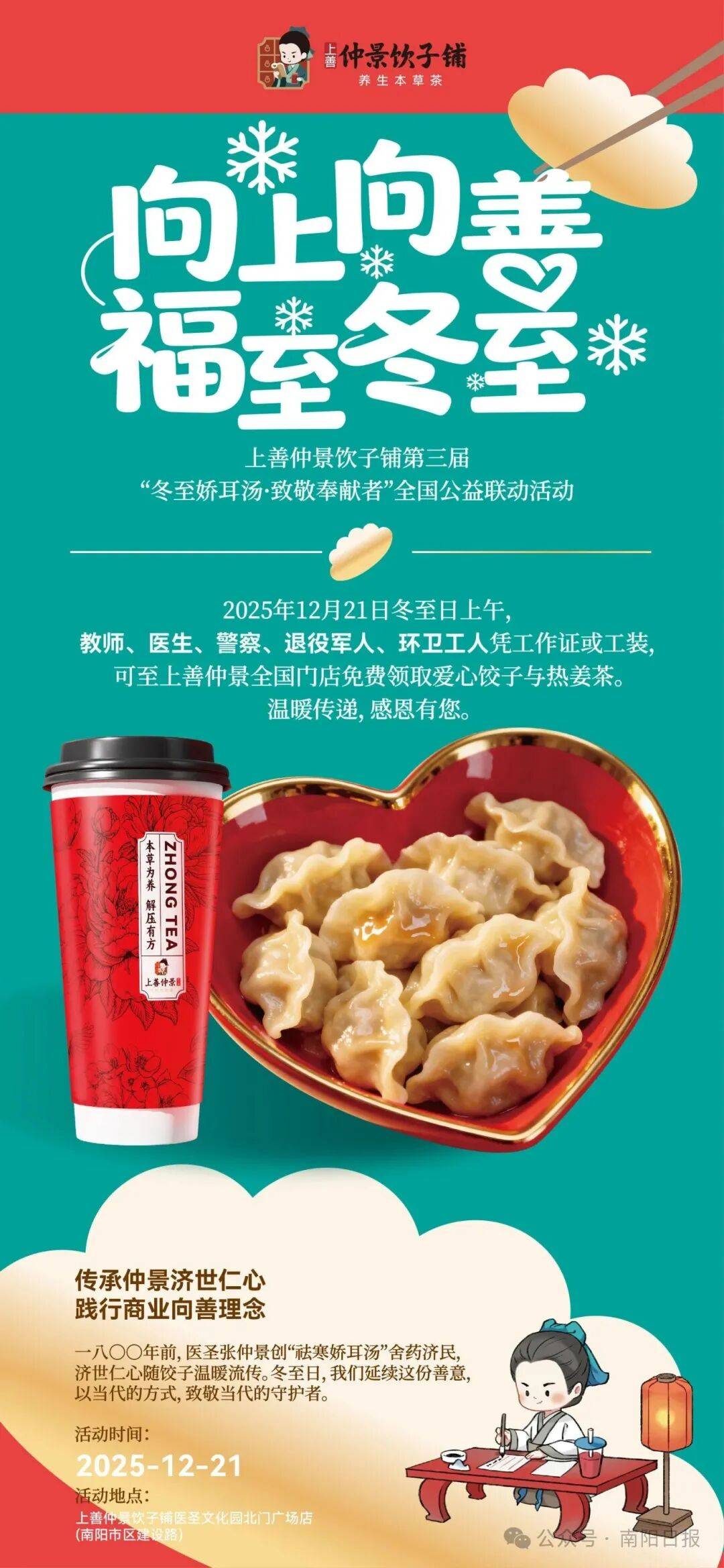 在本周日,一同成为温暖的传递者。如果您身边有辛勤的老师、医生、警察同志、退役军人和环卫工人,别忘了提醒他们:“冬至,上善仲景饮子铺请您吃饺子!” 或者,当您遇见他们时,也可以简单道一声:“辛苦了,谢谢您!”让这份源自仲景故里的善意,经由我们每个人的口耳相传,温暖整座城市。