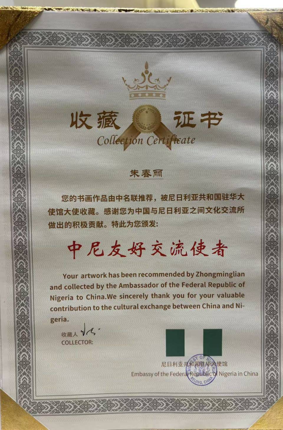 作为“中外文化交流使者”,朱春丽老师深知自己肩负着促进不同国家和地区文化交流与融合的重要使命。每一次的文化交流活动,都是一次心灵的对话,一次情感的传递。通过这些作品,她不仅向尼日利亚和中非的朋友们展示了中国绘画艺术的独特魅力,更表达了中国人民对非洲人民的友好情谊和对“一带一路”倡议下各国友好合作的美好憧憬。