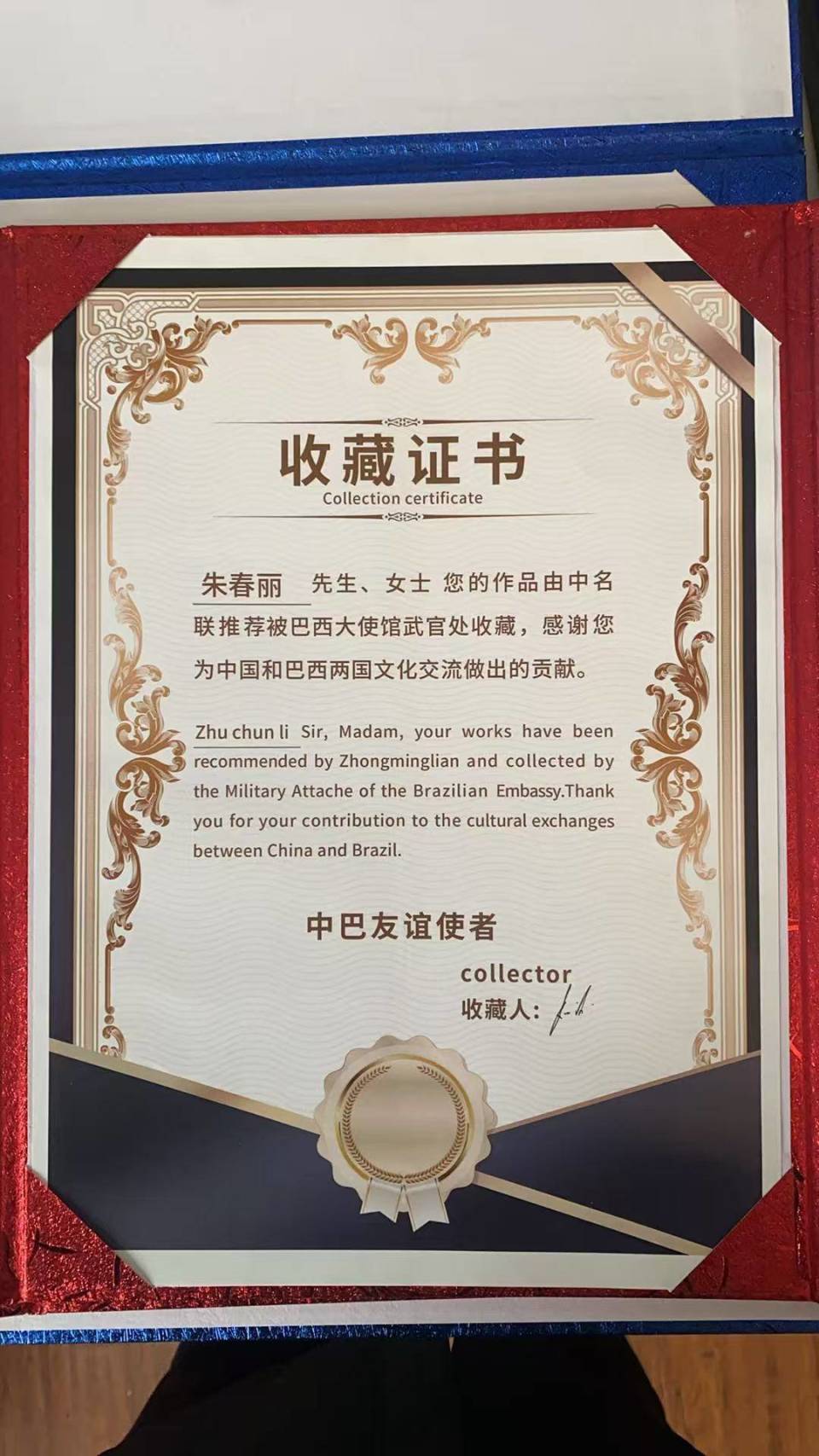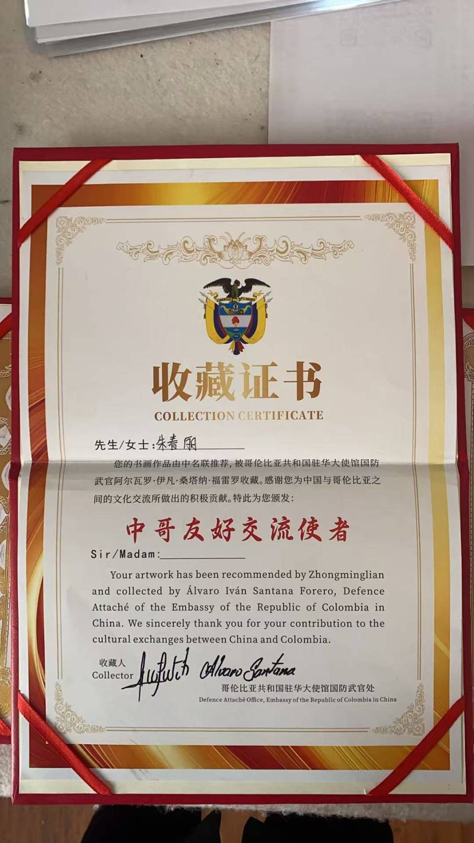 在这充满文化交流热情的氛围中,中名联签约的国礼书画家朱春丽老师迈着沉稳而自信的步伐走上讲台。朱老师来自商文化、火文化的起源地商丘,这片古老而神奇的土地赋予了她深厚的文化底蕴和独特的艺术灵感。她面带微笑,向在场的各位领导、外交官先生女士和老师们亲切问好:“各位领导,外交馆先生,女士,老师们上午好,我是中名联签约的国礼书画家朱春丽,我来自商文化,火文化的起源地商丘。”随后,朱老师郑重地介绍了她为本次活动专门创作的作品——中国画《相互守望》。她深情地说道:“这次我带来的中国画作品是《相互守望》,它的寓意是心心相印,天长地久,相互陪伴。在这幅画中,我以丝瓜为创作元素,丝瓜那长长的藤蔓相互缠绕,就如同人与人之间紧密相连的情谊。希望中尼两国的友谊像这长长的丝瓜一样,千丝缠绕,源远流长。同时,我也真诚地欢迎大家到我的家乡商丘做客,去感受那里悠久的历史文化和独特的风土人情。”朱老师的话语真挚而动人,赢得了现场阵阵热烈的掌声。